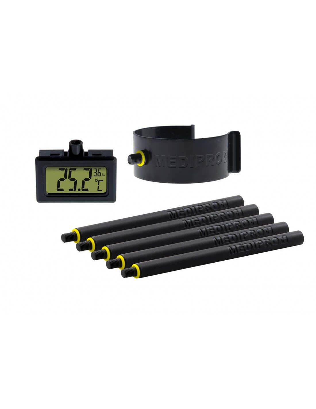 El termohigrómetro incorporado en Medripro es una herramienta valiosa que te da lecturas en tiempo real de las condiciones más críticas para el bienestar de tus plantas, permitiéndote hacer los ajustes necesarios en el ambiente para asegurar un crecimiento saludable.