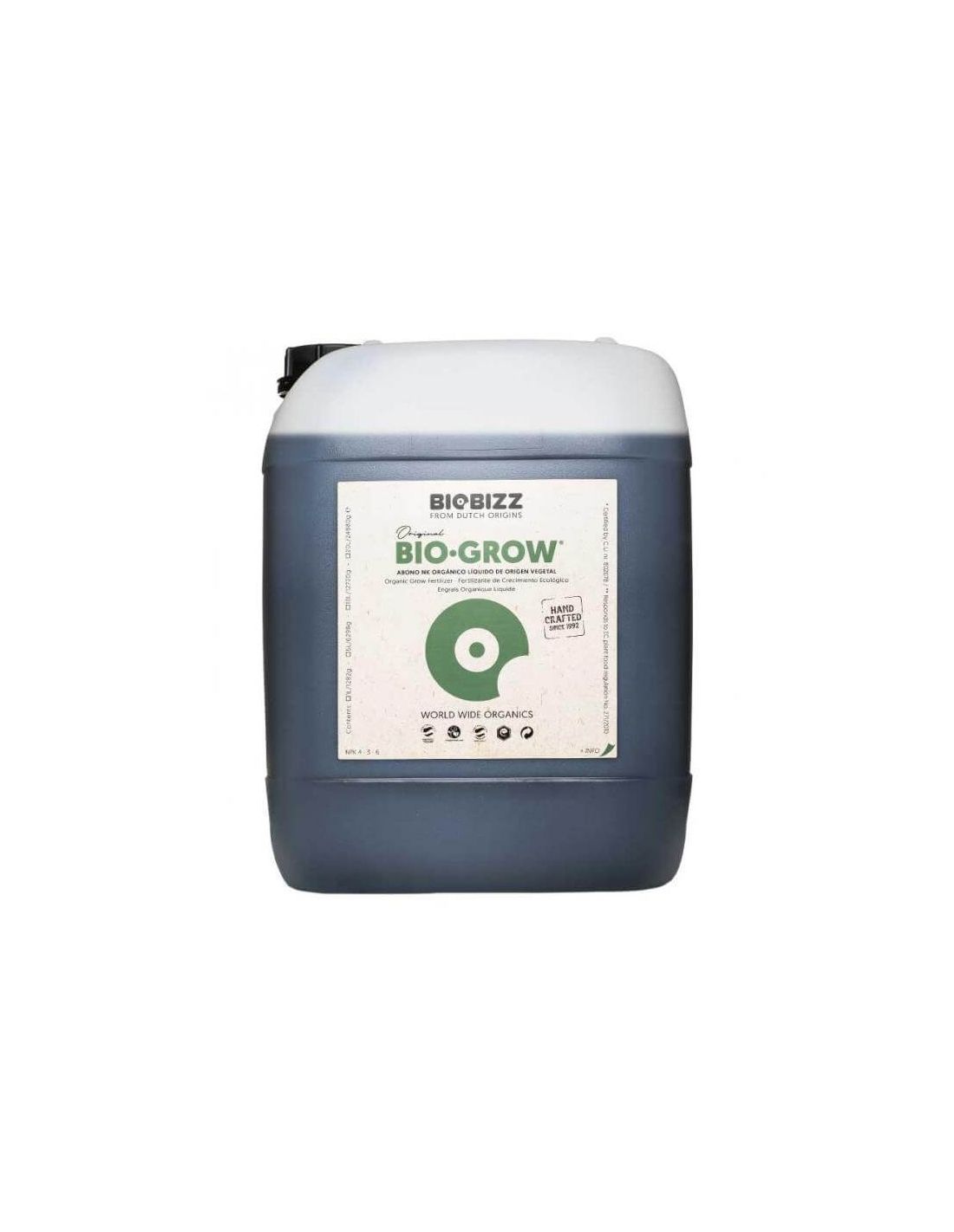 Bio·Grow de 5 L de BioBizz es un fertilizante de crecimiento líquido versátil y eficaz, adecuado para la mayoría de los tipos de tierra y mezclas de sustrato. Su ingrediente principal es el extracto de remolacha azucarera holandesa 100% orgánica, también conocida como vinaza, un subproducto de la transformación del azúcar de la remolacha o caña de azúcar. Este componente se obtiene mediante un proceso de fermentación natural, seguido por la transformación enzimática de almidones en glucosa.