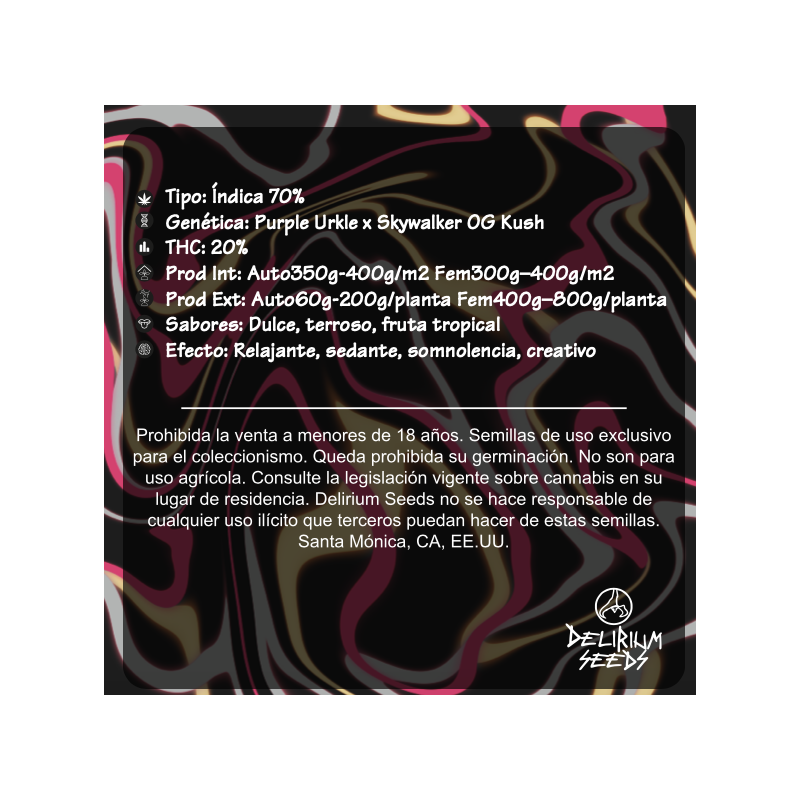 Delirium Seeds Red Rapper Auto x1 es una variedad que ha cautivado a cultivadores por su impresionante paleta de colores y sus efectos profundamente relajantes. Con un 70% de índica, esta cepa, fruto del cruce entre Purple Urkle y Skywalker OG Kush, ofrece un THC del 20% y promete un efecto sedante y creativo. Sus sabores, una combinación de dulzura terrosa y frutas tropicales, son tan cautivadores como sus colores violetas, púrpuras y rojizos. Con rendimientos de hasta 400g/m2 en interior y 200g/planta en exterior, Red Rapper es una opción excelente para cultivadores que buscan una cepa con alta producción de tricomas y una experiencia de cultivo visualmente impresionante. Su aroma dulce y tropical en estado floral complementa perfectamente su efecto sedante y duradero, ideal para momentos de relajación y disfrute musical.