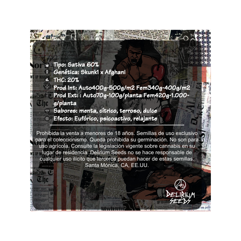 Delirium Seeds Skunk Pop Culture Auto X2 es una variedad que rinde homenaje a los clásicos del cannabis, combinando la robustez de la genética Skunk1 con la resistencia de Afghani. Con un 60% de sativa y un THC del 20%, esta cepa promete un efecto cerebral prolongado, psicoactivo y eufórico. Sus sabores, una mezcla intrigante de menta, cítrico, terroso y dulce, ofrecen una experiencia sensorial única. Con una producción impresionante de hasta 500g/m2 en interior y 100g/planta en exterior, Skunk Pop Culture es ideal para cultivadores que buscan una variedad de alto rendimiento y gran vigor. Esta cepa no solo destaca por su excelente resistencia a enfermedades, sino también por sus aromas cautivadores y su impacto cerebral intenso.