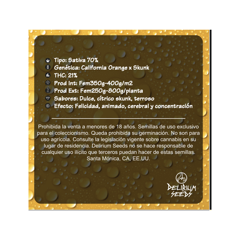 Delirium Seeds Delirium Tangi Fem x2 te invita a experimentar un mundo de creatividad y alegría. Esta cepa sativa dominante, resultado del cruce entre California Orange y Skunk, ofrece una experiencia equilibrada con un THC del 21%. Disfruta de un rendimiento destacado, tanto en interior con 350-400g/m² como en exterior con 250-800g/planta. Su sabor tropical lleno de tonos cítricos y frutosos complementa su rico aroma. Esta variedad te dejará energético, creativo y relajado, perfecta para cualquier momento del día.
