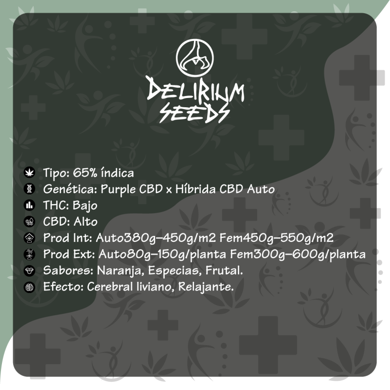 -Las Delirium Seeds Medical Cbd Fem X1 representan lo último en cannabis terapéutico, una oferta exclusiva para conocedores del bienestar natural. Esta famosa cepa californiana, resultado del cruce entre Purple CBD y una Híbrida CBD Auto, destaca por su alto contenido en CBD y bajo THC, ideal para quienes buscan beneficios médicos sin efectos psicoactivos intensos. Con un 65% de índica, estas semillas son fáciles de cultivar y ofrecen una productividad sobresaliente: hasta 450-550g/m² en interior y 300-600g/planta en exterior. Su perfil de sabor combina naranja, especias y toques frutales, creando una experiencia relajante y curativa. Tipo: 65% índica Genética: Purple CBD x Híbrida CBD Auto THC: Bajo CBD: Alto Prod Int: Auto380g450g/m2 Fem450g550g/m2 Prod Ext: Auto80g150g/planta Fem300g600g/planta Sabores: Naranja, Especias, Frutal. Efecto: Cerebral liviano, Relajante.