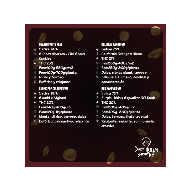 -El Delirium Seeds Mix Vegas Rush Fem x4 es una experiencia de cultivo comparable a una noche emocionante en Las Vegas. Este mix incluye Red Rapper Fem, Delirium Tangi Fem, Skunk Pop Culture Fem y Gelato Fruits Fem, cada una aportando su toque único de sabores y efectos. Red Rapper, con un 70% de índica, ofrece relajación profunda con sabores dulces y terrosos. Delirium Tangi, una sativa dominante, brinda un efecto animado y concentrado con toques cítricos y terrosos. Skunk Pop Culture combina la euforia y la psicoactividad con un sabor a menta y cítricos. Gelato Fruits, finalmente, proporciona una experiencia eufórica y relajante con sus sabores dulces y terrosos. Este mix es perfecto para aquellos que buscan variedad y disfrutar de cada momento del proceso de cultivo, desde la siembra hasta la cosecha. Red rapper Fem Tipo: Índica 70% Genética: Purple Urkle x Skywalker OG Kush THC: 20% Prod Int: 300g400g/m2 Prod Ext: 400g800g/planta Sabores: Dulce, terroso, fruta tropical Efecto: Relajante, sedante, somnolencia, creativo Periodo Floración: 63-68 días Delirium Tangi Fem Tipo: Sativa 70% Genética: California Orange x Skunk THC: 21% Prod Int: 350g - 400g/m2 Prod Ext: 250g - 800g/planta Sabores: dulce, cítrico skunk, terroso Efecto: felicidad, animado, cerebral y concentración Periodo Floración: 54-64 días Skunk Pop culture Fem Tipo: Sativa 60% Genética: Skunk1 x Afghani THC: 20% Prod Int: 340g-400g/m2 Prod Ext: 420g-1kg/planta Sabores: menta, cítrico, terroso, dulce Efecto: eufórico, psicoactivo, relajante Periodo Floración: 45-55 días Gelato Fruits Fem Tipo: Sativa 60% Genética: Sunset Sherbet x Girl Scout Cookies THC: 23% Prod Int: Fem400g-550g/mt2 Prod Ext: Fem400g-700g/planta Sabores: dulce y terroso Efecto: eufórico y relajante Periodo Floración: 62-65 días