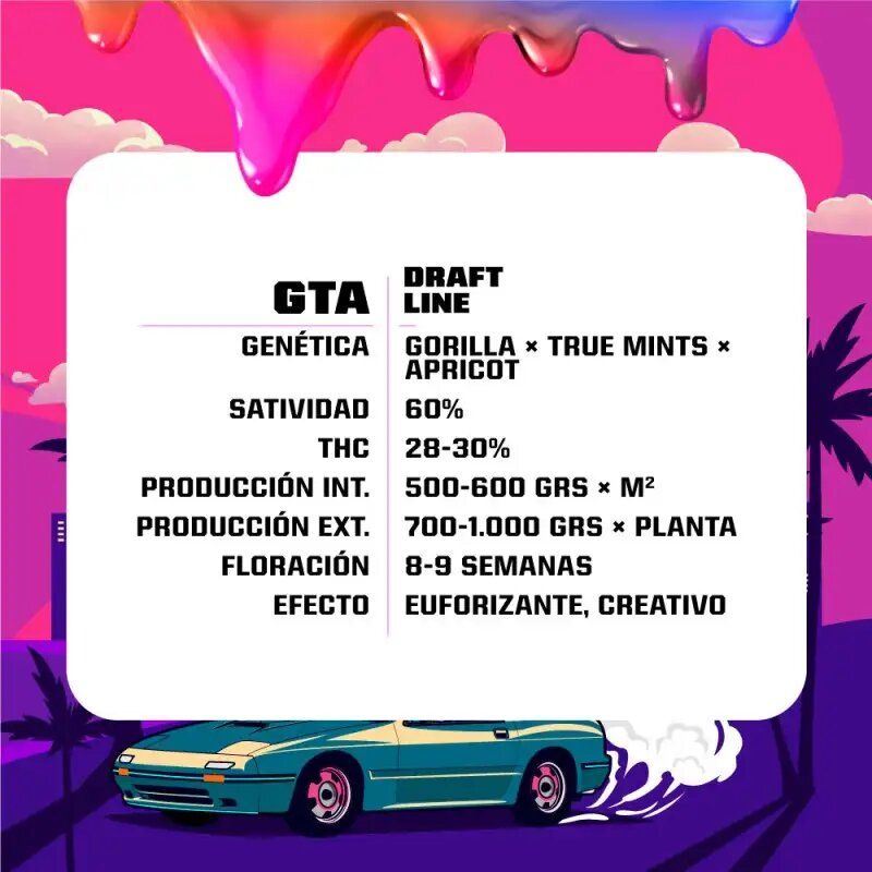 La GTA Feminized X7 de BSF Seeds es una variedad híbrida de predominancia sativa (60% sativa / 40% índica), producto de la combinación de Gorilla, True Mints y Apricot. Con un contenido de THC entre el 28% y el 30%, esta genética ofrece potencia, sabor único y altos rendimientos, siendo una excelente elección para cultivadores de todos los niveles.