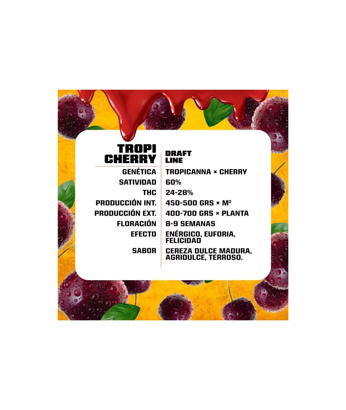 El perfil de sabor de la TropiCherry Feminized X2 es una mezcla excepcional de cereza dulce madura, notas agridulces y cítricas, y un fondo terroso. Su aroma y sabor se complementan con terpenos dominantes como el limoneno, cariofileno y pineno, creando una experiencia sensorial inolvidable.
