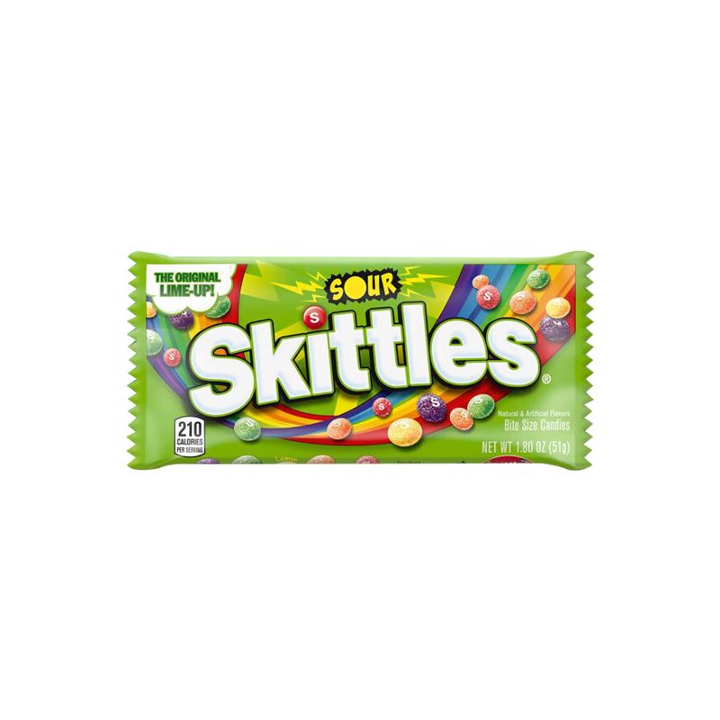 -Vive una experiencia explosiva de sabores ácidos con los populares Skittles Sour. Cada bolsa de 51 gramos contiene caramelos masticables cubiertos con una capa ultra ácida que realza los sabores frutales en cada bocado. Con una mezcla de sabores vibrantes y jugosos, como lima, limón, fresa, naranja y uva, estos caramelos son perfectos para quienes buscan un toque ácido en sus snacks.