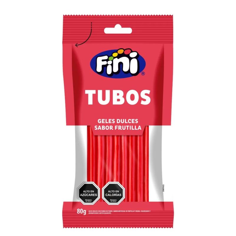 -Tubos de Fini - Sabor Tutti Frutti es un producto de confitería que combina el sabor dulce y ácido en una textura suave y masticable. Cada paquete contiene 80 gramos de geles dulces en forma de tubos, recubiertos con una fina capa de azúcar que realza su sabor único. Ideales para disfrutar como un snack, estos tubos están elaborados con sabor artificial de tutti frutti, brindando una explosión de sabor en cada bocado.