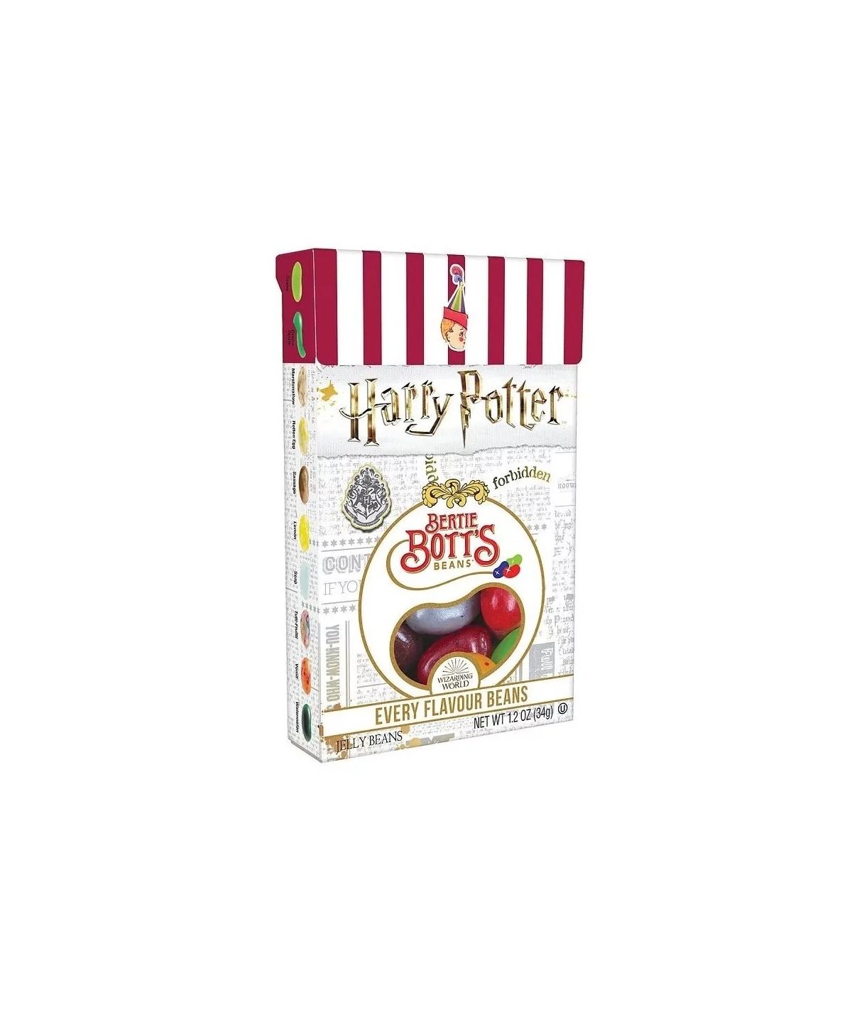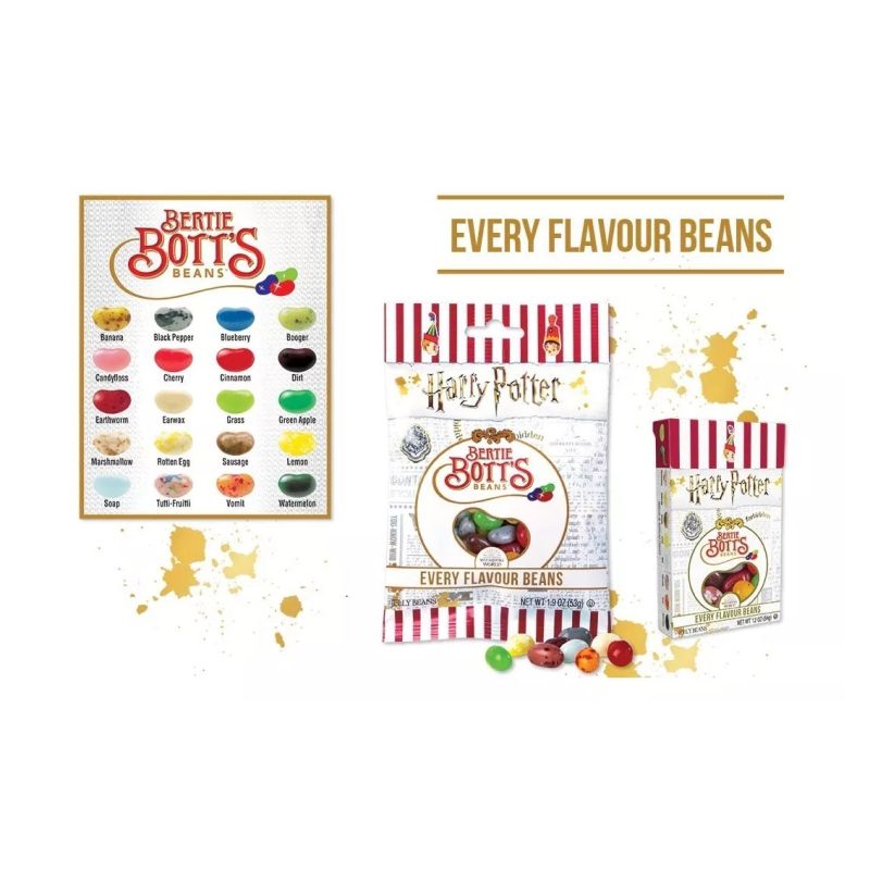 Sabores incluidos: Plátano, pimienta, arándano, moco, candy, guinda, canela, tierra, gusano, cera de oído, pasto, manzana verde, malvavisco, huevo podrido, salchicha, limón, jabón, tutti frutti, vómito y sandía.