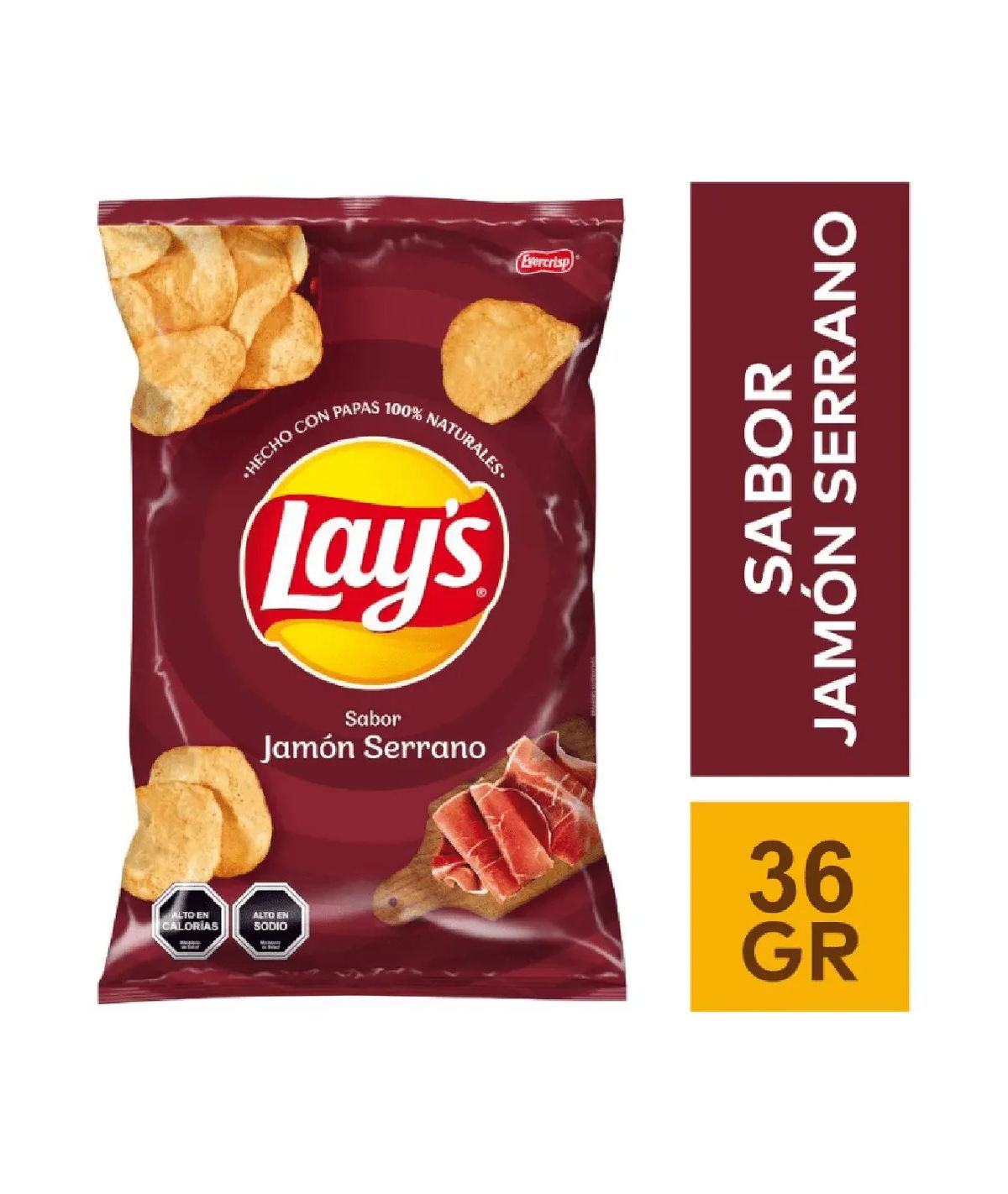 -Las Lay’s sabor Jamón Serrano de 36 gramos son el snack perfecto para quienes buscan algo más que unas simples papas fritas. Con el auténtico sabor del jamón serrano, estas crujientes papas están hechas con ingredientes seleccionados y papas 100% naturales.
