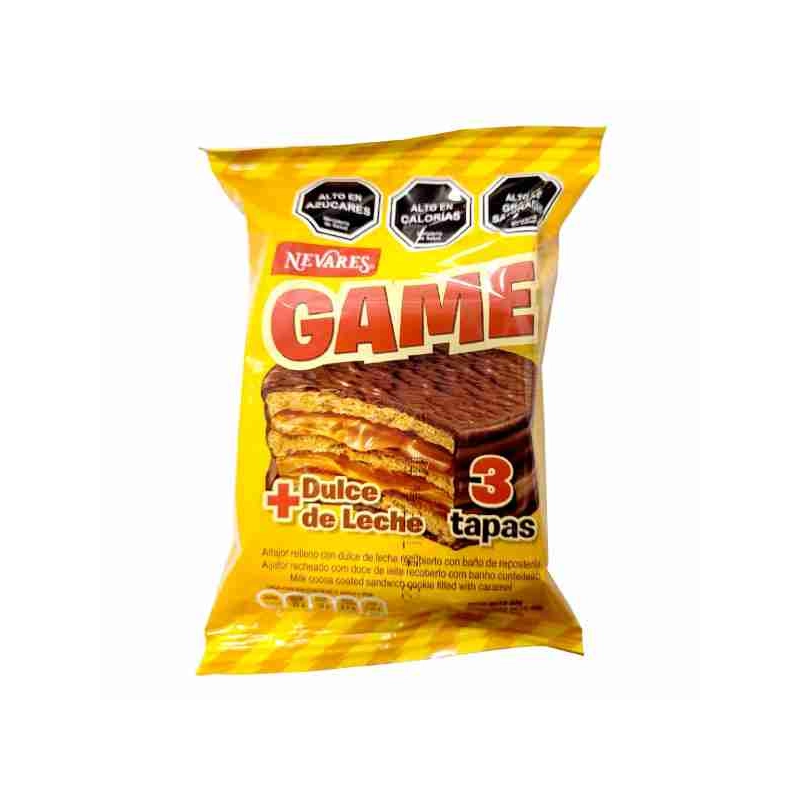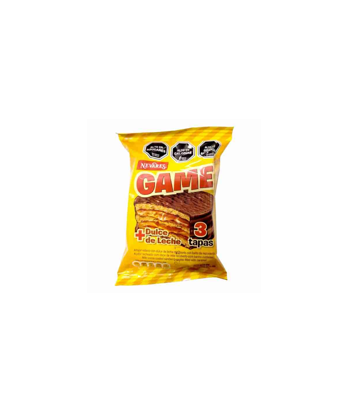 Alfajor Nevares Game con 3 tapas y más dulce de leche. Cubierto con baño de repostería y relleno cremoso. Ideal como snack dulce y energético.