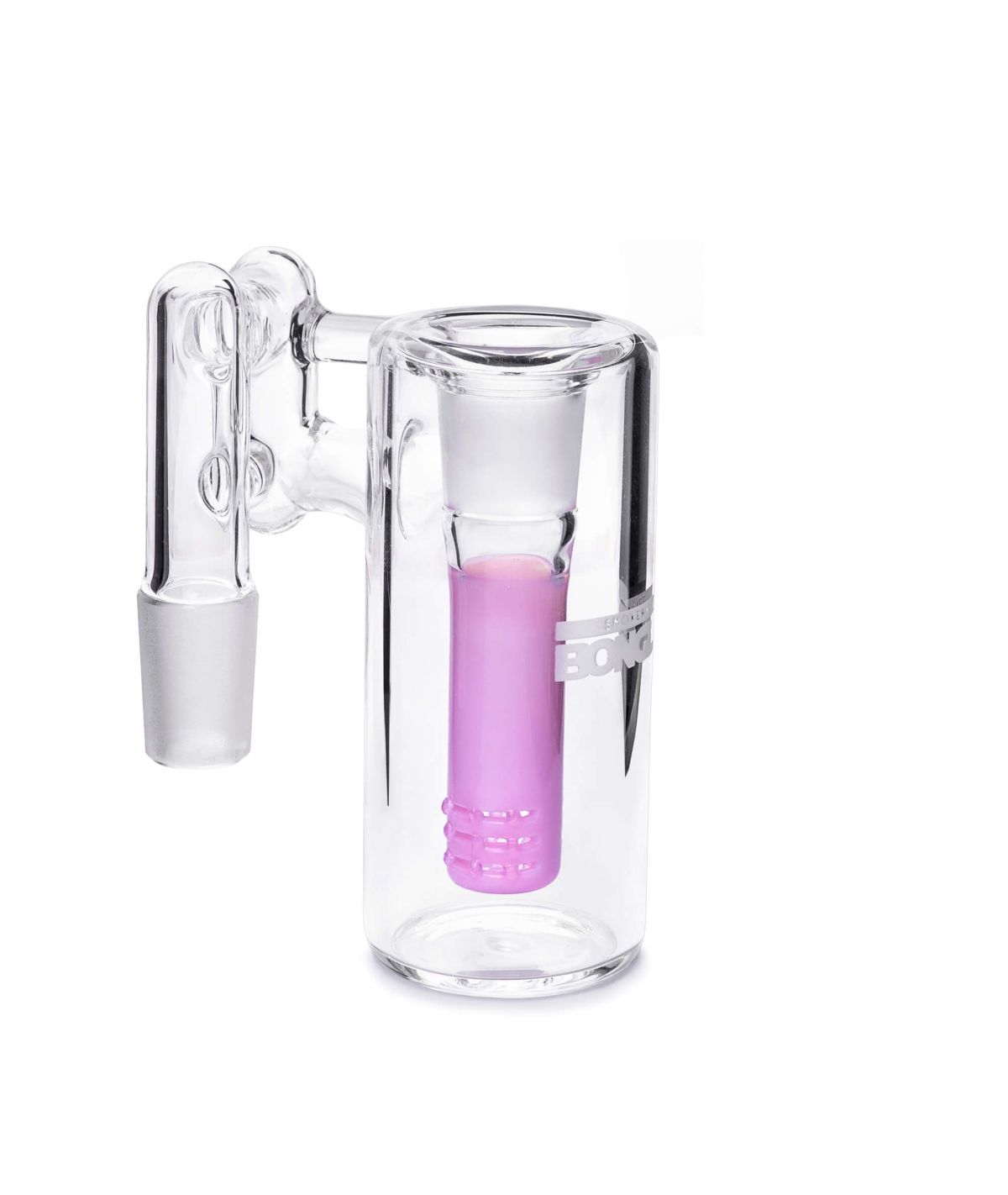Atrapa ceniza Bonglab rosado con percolador, conexión macho 14 mm y ángulo de 90°. Filtra impurezas y mantiene tu bong limpio con estilo compacto y eficiente.