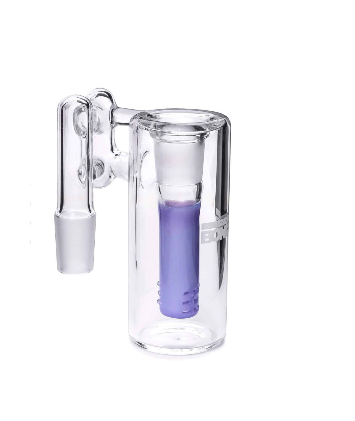 Atrapa ceniza Bonglab de 18 mm con percolador y ángulo de 90°. Mejora la filtración del humo, reduce residuos y protege tu bong. Fabricado en vidrio resistente, color morado.