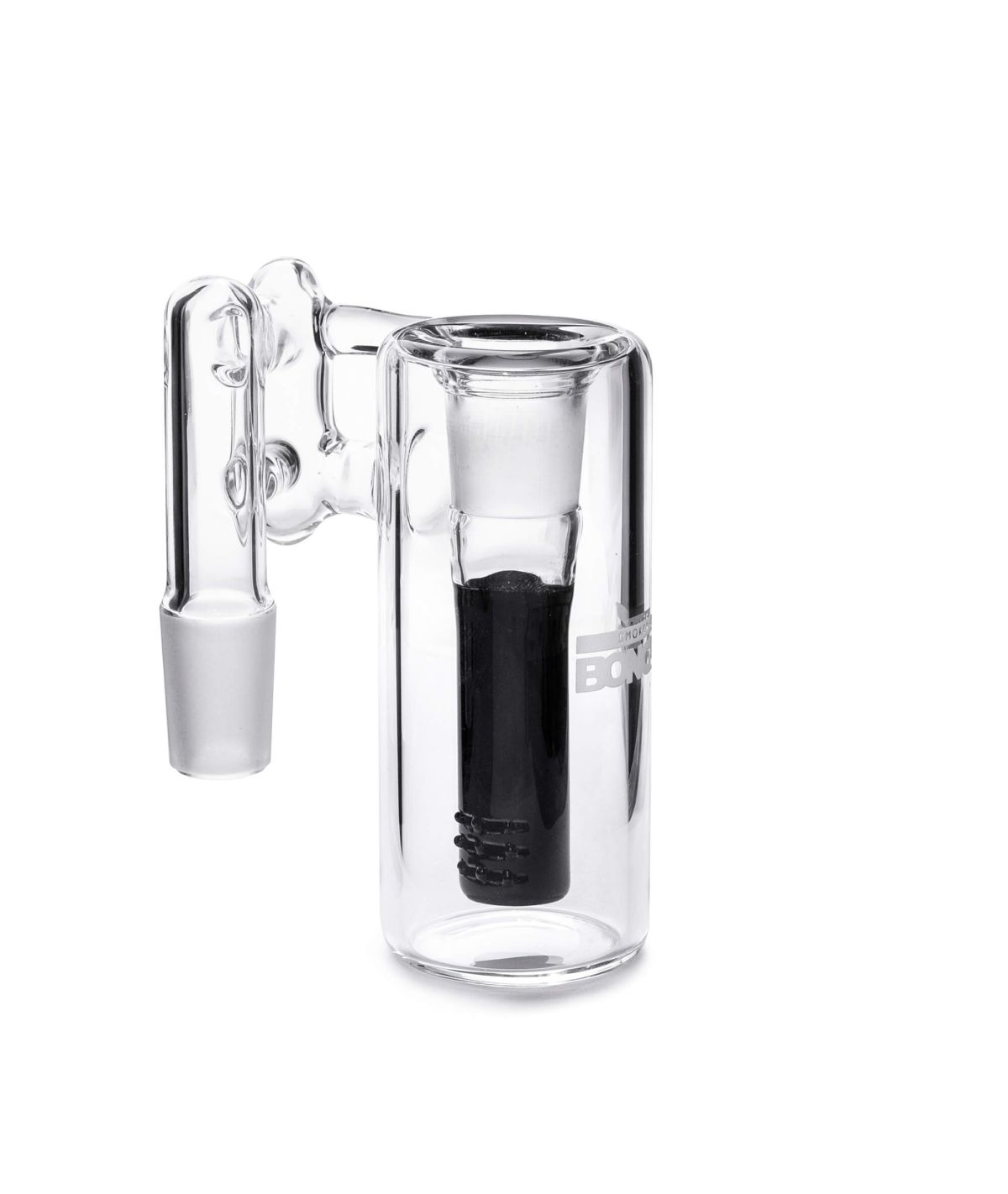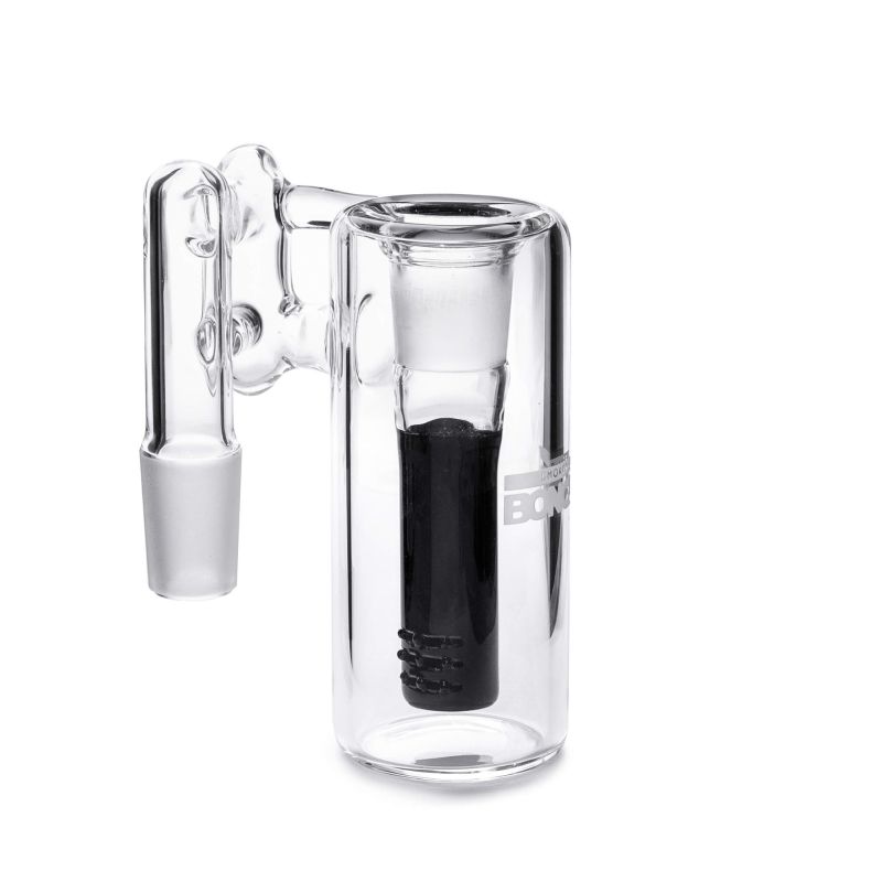 Atrapa ceniza Bonglab negro, con percolador interno, conexión macho de 18 mm y ángulo de 90°. Filtra y enfría el humo, manteniendo tu bong limpio por más tiempo.