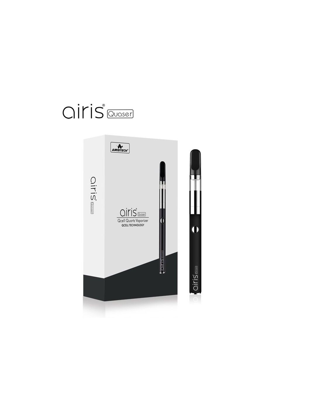 Vaporizador Airistech Quaser Black con batería de 420mAh, 3 niveles de voltaje y sistema Dab-Mouthpiece con herramienta de carga integrada. Ideal para concentrados, compacto y discreto.