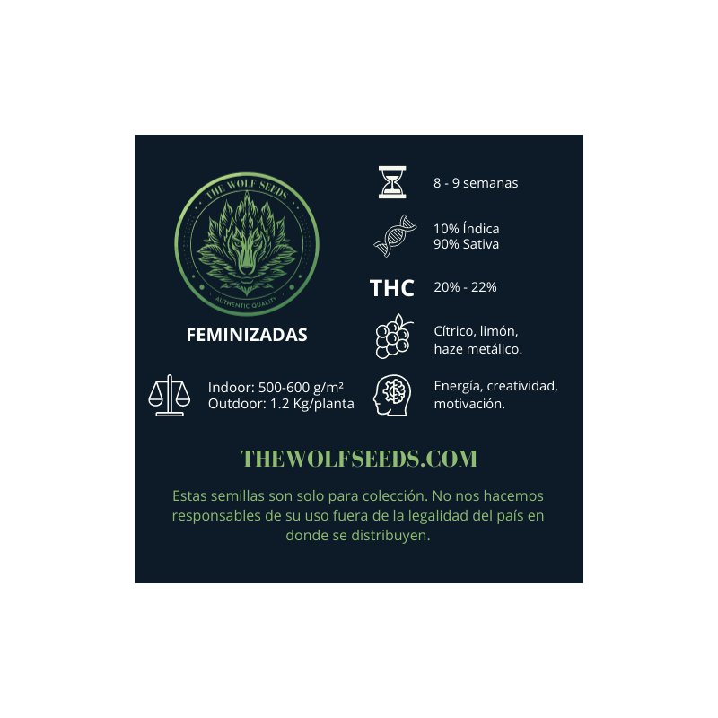 Unete a una aventura celestial con Lunar Haze del banco Wolf Seeds, una luminosa variedad de cannabis nacida de la cautivadora unión de Super Lemon Haze y Amnesia. Con un 90% de brillo Sativa, esta maravilla botánica brilla intensamente.