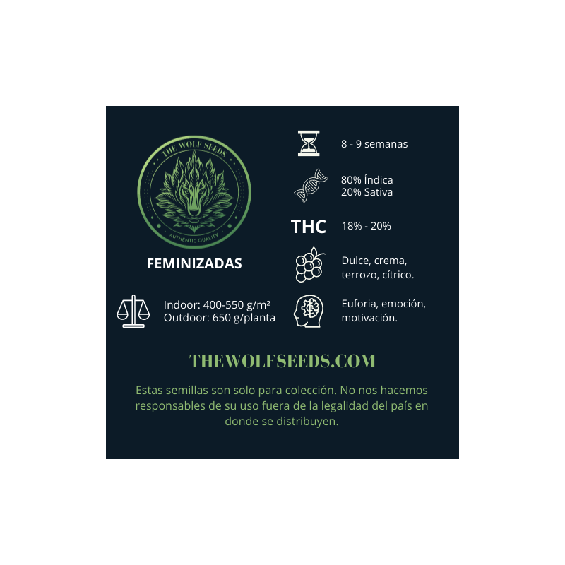 -The Wolf Seeds se ha consolidado como una marca distintiva en Chile, ofreciendo semillas de cannabis con calidad norteamericana que satisfacen a los cultivadores más exigentes. Su catálogo incluye variedades feminizadas cuidadosamente seleccionadas para proporcionar una experiencia única, destacando por su riqueza en sabores y efectos terapéuticos. Con cepas como Wild Timber y Alpha Blue, The Wolf Seeds combina la robustez genética con perfiles aromáticos complejos, creando una experiencia sensorial comparable a un festival de sabores y aromas. Comprometidos con la excelencia y la innovación, The Wolf Seeds es la elección preferida para quienes buscan diferenciarse en el mercado con productos de alta calidad y rendimientos óptimos.