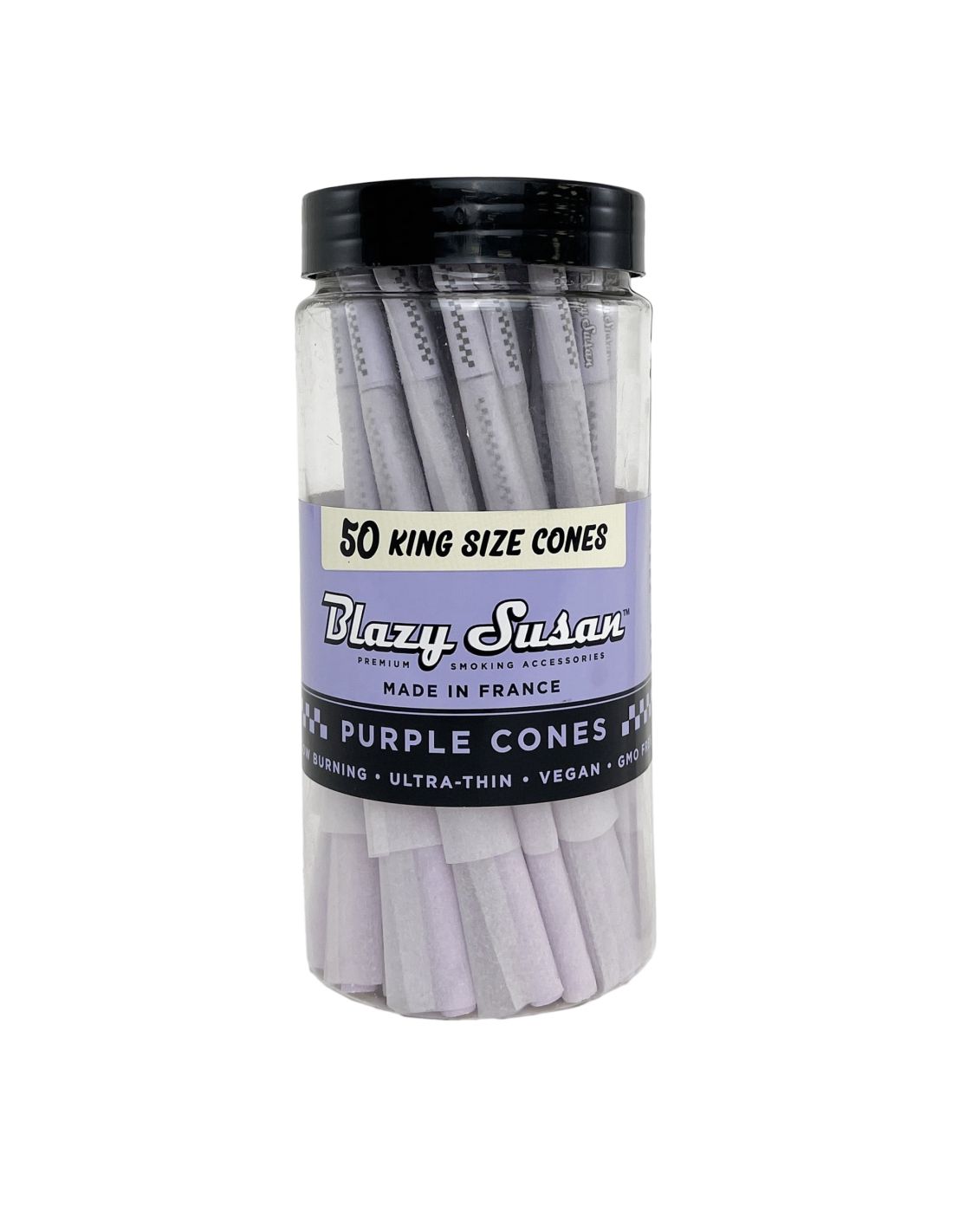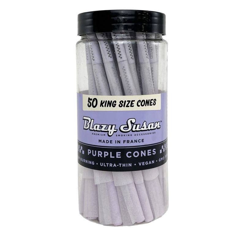 Los Conos Pre Roll Purple King Size Jar 50U de Blazy Susan destacan por su color vibrante y su calidad superior. Este tarro contiene 50 conos pre enrollados de tamaño King Size, fabricados en Francia con papel vegano y libre de OGM, garantizando una combustión lenta y uniforme. Los conos morados son ultra delgados, ofreciendo una experiencia de fumar suave y sofisticada. Su presentación en tarro añade un toque de elegancia y conveniencia.