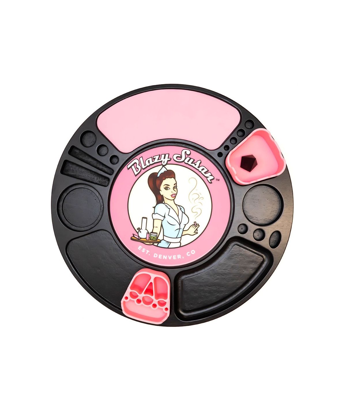 Con un diámetro de 39,37 cm, la Blazy Susan tiene espacio para encendedores, pre rolls, bangers, tu teléfono móvil y más. Cada bandeja incluye una alfombrilla de dab en el centro y un inserto de silicona ""slap"" en forma de semicírculo en la parte inferior. Diseñada a partir de la retroalimentación de los consumidores, esta bandeja ofrece más funcionalidad que cualquier otra en el mercado. Dale un giro y transforma tu mesa de café con estilo y eficiencia.