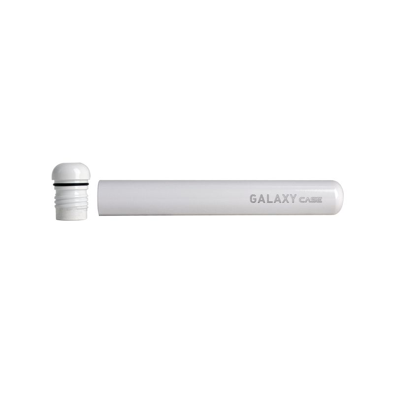 Galaxy Case Ceramic White es un estuche discreto y hermético para transportar caños o pitos sin filtración de olores. Con cuerpo de aluminio recubierto en cerámica blanca, mide 11 cm x 1,5 cm y posee cierre de rosca sellado. Ideal para quienes buscan elegancia, protección y máxima higiene en un solo accesorio.