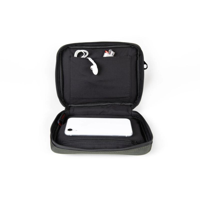 Ofrece cuatro compartimentos funcionales: uno principal con cremallera y candado, un bolsillo externo con solapa, un bolsillo interno abierto y otro con cierre. Su diseño resistente y discreto en color negro lo hace ideal para viajes, almacenamiento diario o transporte de objetos delicados.