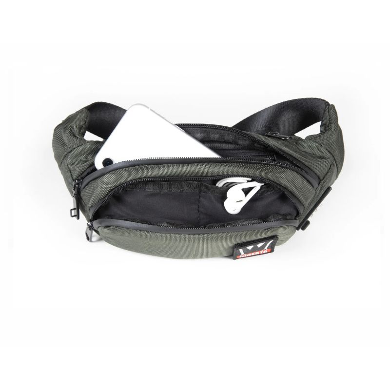 Riñonera smell proof con candado de combinación, filtro de carbono y siete compartimentos, diseñada para transportar con seguridad y estilo.