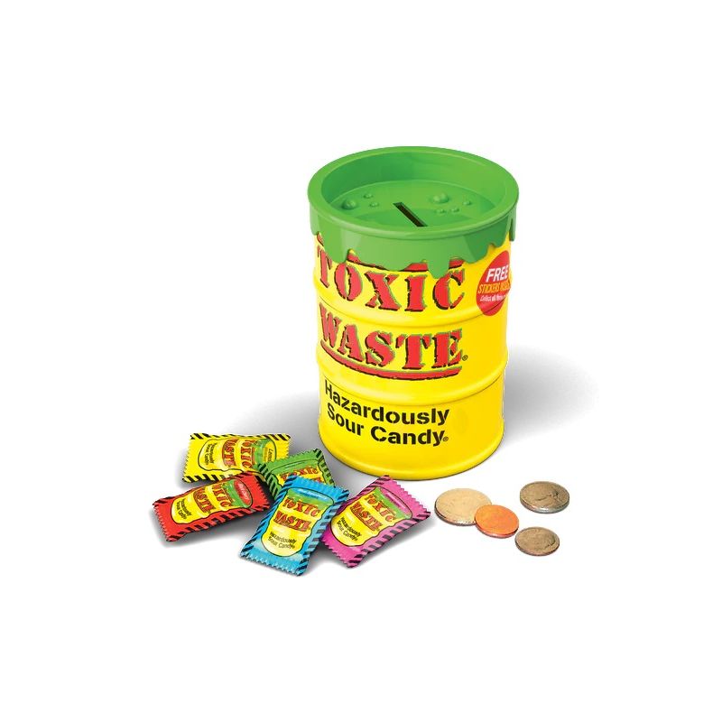 -Prepárate para una experiencia intensa con los caramelos más ácidos del mercado: Toxic Waste Yellow Bank. Esta edición contiene cinco sabores diabólicamente frutales —manzana, sandía, frambuesa azul, limón y cereza negra—, todos diseñados para llevar tus papilas gustativas al límite.