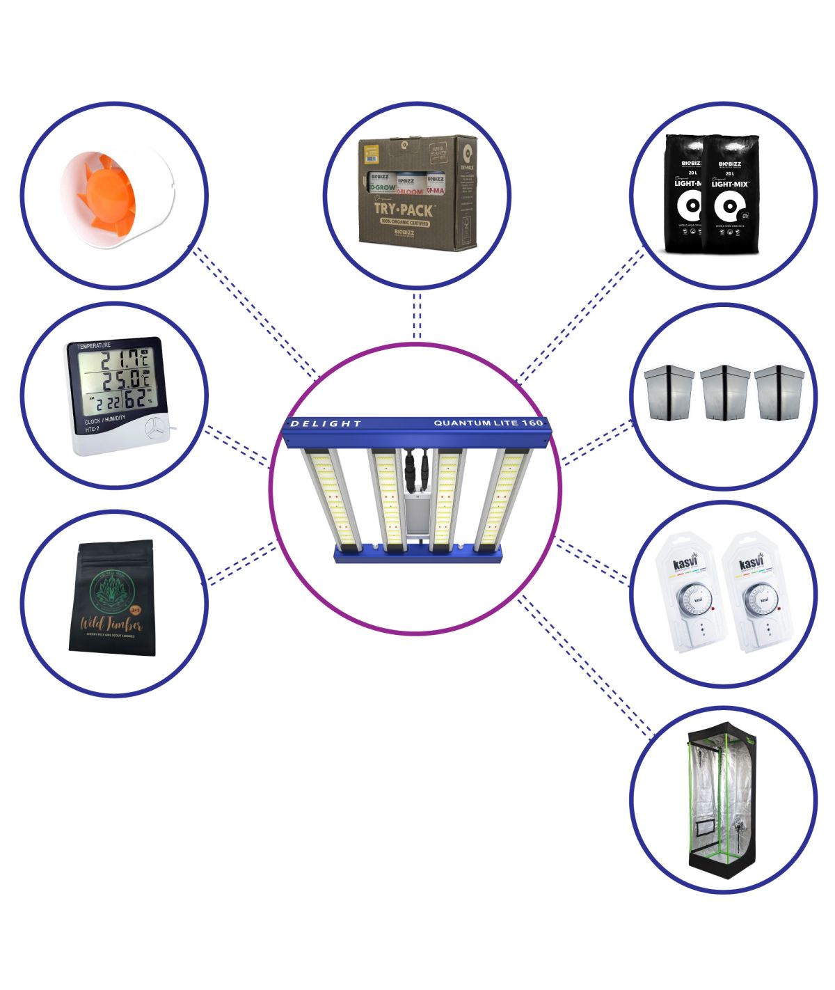 El pack está pensado para mantener condiciones ambientales ideales gracias a su sistema de extracción, timer doble, termohigrómetro y fertilización orgánica con el Try Pack Biobizz. Además, incluye sustrato y macetas listas para trasplantar y una semilla feminizada The Wolf Seeds X3+1, perfecta para empezar.