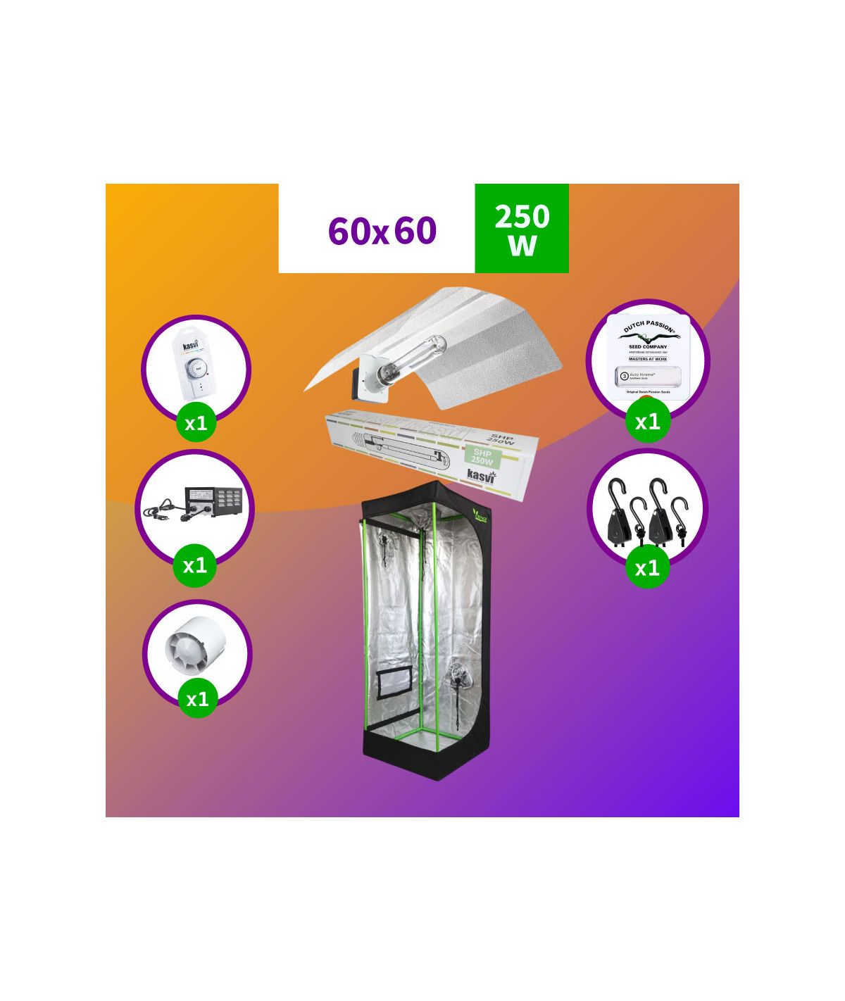 Una carpa de 60x60x160 cm, un Balastro magnético de 250W con cable incluido que le entregarán a tus plantas la potencia necesaria para ése espacio de cultivo, además incluye una ampolleta dual HPS y HM, reflectante y poleas para que puedas subir o bajar fácilmente la luz a la distancia recomendada para tus plantas.