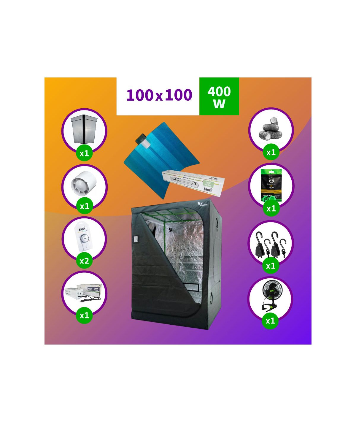 El Pack Sodio Indoor 100X100 Full Hps - 400W es ideal para maximizar el rendimiento de tus plantas de cannabis en espacios cerrados. Incluye una ampolleta HPS de 400W, un reflector de alta eficiencia, una carpa de cultivo de 100x100x200, y extractores para ventilación óptima. Con un balastro magnético de 400W y accesorios esenciales como poleas, timers, y un termohigrómetro, este pack ofrece un entorno de cultivo completo y eficiente. Además, incluye semillas y nutrientes para empezar tu cultivo de inmediato. Perfecto para cultivadores principiantes y experimentados.