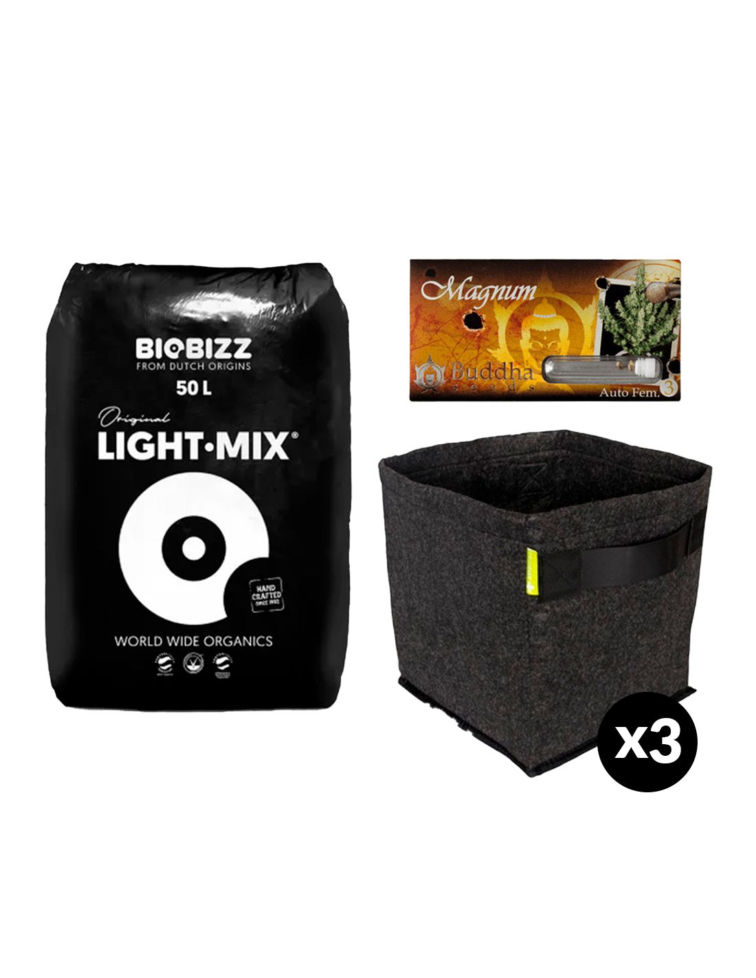 El Pack de Cultivo Magnum de Buddha Seeds ofrece todo lo necesario para un cultivo exitoso de cannabis autofloreciente. Incluye 3 semillas Magnum, 3 macetas textiles Propot de 15 litros y 50 litros de sustrato Light Mix de Biobizz. Este pack garantiza un crecimiento óptimo, con macetas que permiten la respiración de las raíces y un sustrato orgánico que promueve la microactividad del suelo. ¡Disfruta de cosechas abundantes y un potente efecto con aromas y sabores exquisitos con este pack completo!
