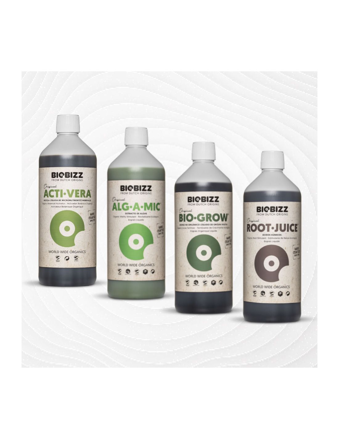 El pack incluye Acti·Vera, un activador botánico que potencia el sistema inmunológico de la planta y mejora el metabolismo; Alg·A·Mic, un revitalizante a base de algas que alivia el estrés y vigoriza la vitalidad de la planta; Bio·Grow, un fertilizante líquido para el crecimiento que proporciona todos los nutrientes necesarios durante la fase vegetativa; y Root·Juice, una mezcla de ácidos húmicos y fúlvicos que estimula la proliferación de raíces fuertes y la absorción eficiente de nutrientes. Cada uno de estos productos está formulado con ingredientes de la más alta calidad para asegurar que las plantas reciban una alimentación equilibrada y orgánica, vital para su desarrollo y la maximización de su potencial genético.