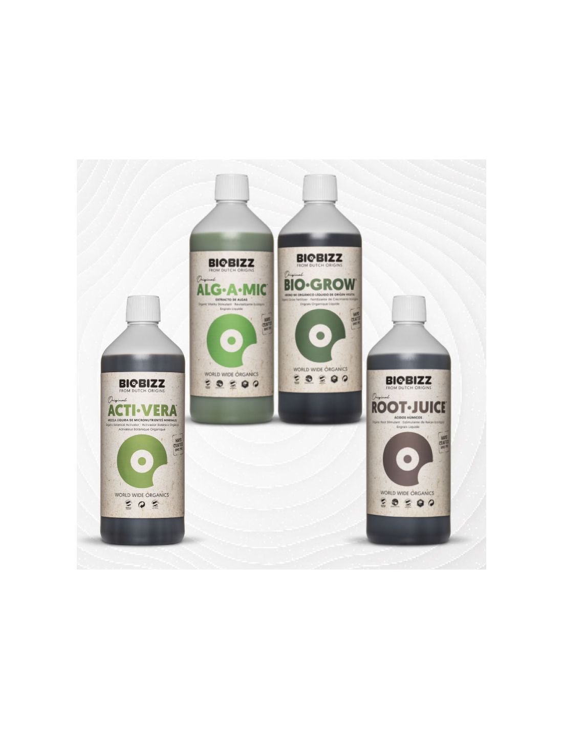 El pack incluye Acti·Vera, un activador botánico que potencia el sistema inmunológico de la planta y mejora el metabolismo; Alg·A·Mic, un revitalizante a base de algas que alivia el estrés y vigoriza la vitalidad de la planta; Bio·Grow, un fertilizante líquido para el crecimiento que proporciona todos los nutrientes necesarios durante la fase vegetativa; y Root·Juice, una mezcla de ácidos húmicos y fúlvicos que estimula la proliferación de raíces fuertes y la absorción eficiente de nutrientes. Cada uno de estos productos está formulado con ingredientes de la más alta calidad para asegurar que las plantas reciban una alimentación equilibrada y orgánica, vital para su desarrollo y la maximización de su potencial genético.