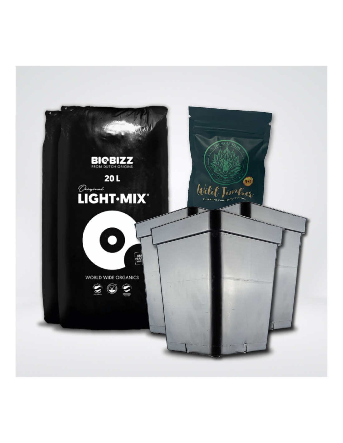 El Pack Light Mix 20LT y Macetas 11 LT es ideal para maximizar los resultados en el cultivo de cannabis. Incluye 2 bolsas de sustrato Light Mix Biobizz, 3 macetas de 11 litros y un pack de semillas The Wolf Seeds (Wild Timber F1). Proporciona una base nutritiva y un excelente drenaje, asegurando un crecimiento saludable y una producción abundante de flores. Perfecto para cultivadores principiantes y expertos.