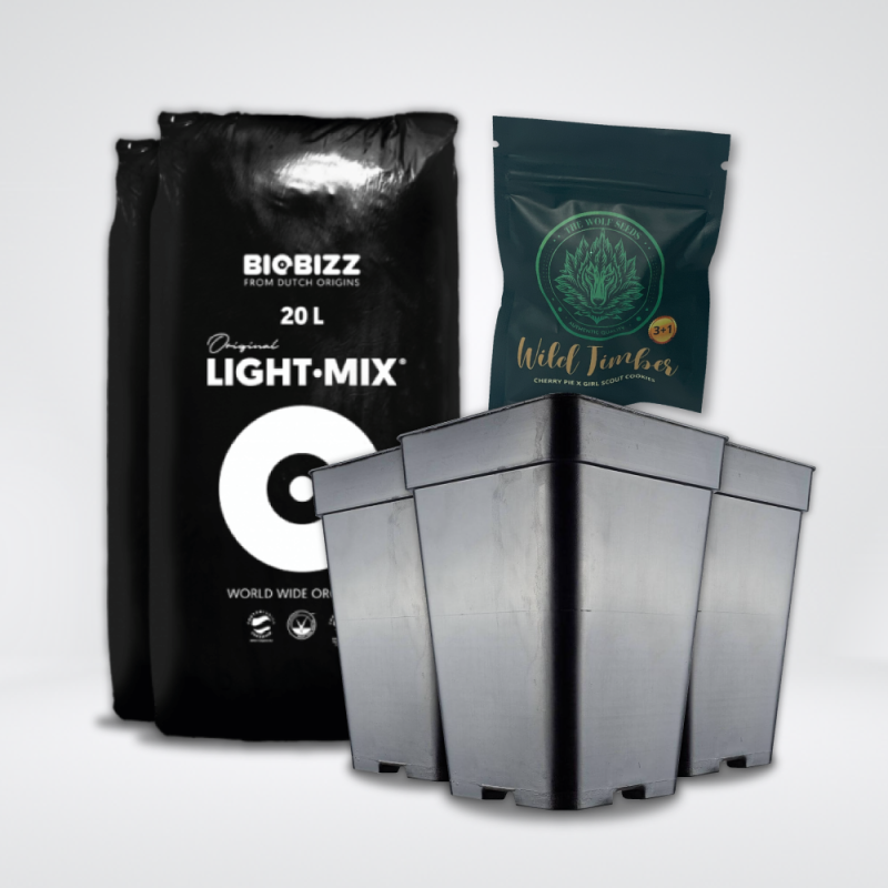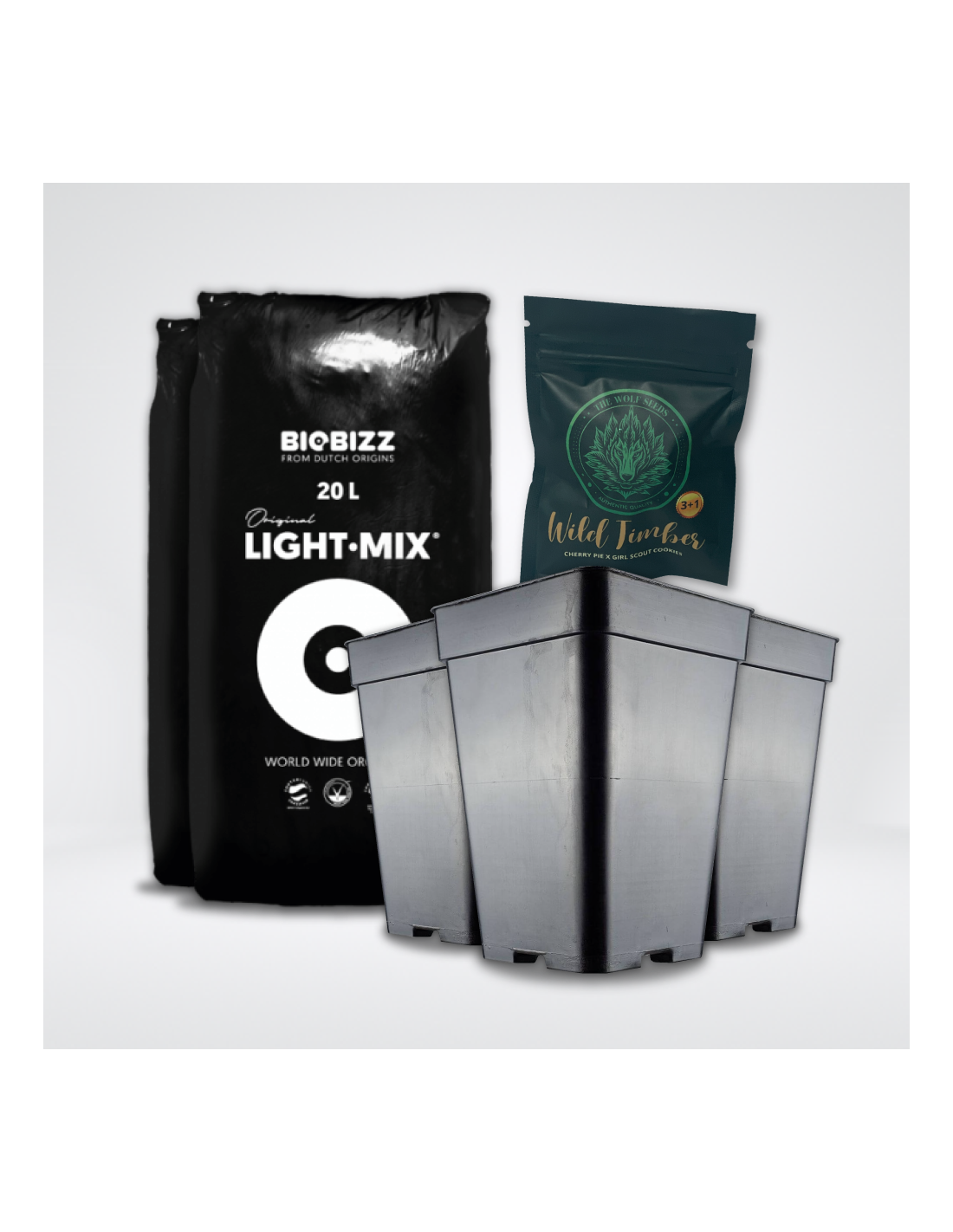 El Pack Light Mix 20LT y Macetas 7 LT es ideal para maximizar los resultados en el cultivo de cannabis. Incluye 2 bolsas de sustrato Light Mix Biobizz, 3 macetas de 7 litros y un pack de semillas The Wolf Seeds (Wild Timber F1). Proporciona una base nutritiva y un excelente drenaje, asegurando un crecimiento saludable y una producción abundante de flores. Perfecto para cultivadores principiantes y expertos.