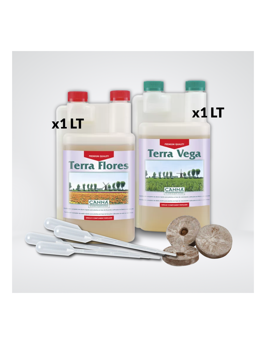 -Canna Terra Vega es ideal para la fase de crecimiento, proporcionando los nutrientes necesarios para un desarrollo vigoroso. Su fórmula rica en nitrógeno promueve la formación de tejidos verdes y robustos, esenciales para un buen comienzo. Canna Terra Flores, por su parte, está diseñado para la fase de floración, aportando los elementos esenciales que las plantas necesitan para una abundante producción de flores y frutos. Su fórmula equilibrada y rica en potasio y fósforo asegura una floración exuberante y de alta calidad.