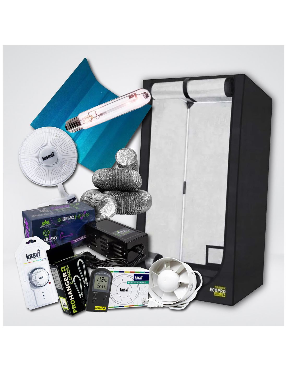 -Transforma tu espacio con el "KIT INDOOR MEDIO SODIO 80X80X160", un epicentro de tecnología y precisión para aquellos que buscan la perfección en el cultivo indoor. Dentro de la robusta carpa Probox Ecopro de Garden Highpro, tu santuario de 80x80x160 se ilumina con la radiante ampolleta grow&bloom de 250w de Grow Genetics, reflejada óptimamente por el reflector watermark stuco conbox protection. Pero ahí no termina la magia; con un flujo de aire adecuado, control de temperatura y un ambiente controlado gracias al timer análogo de Kasvi y al termohigrómetro prohygro basic, tus plantas experimentarán un oasis de condiciones perfectas. No es solo un kit, es una experiencia de cultivo enriquecedora. Contenido: 1 Carpa Probox Ecopro de 80x80x160 de la marca Garden Highpro 1 Reflector watermark stuco conbox protection 1 Balastro magnénico de 250w de la marca Grow Genetics 1 Ampollera Sodio 250W lumax pro de la marca Garden Highpro, 1 Timer análogo de la marca Kasvi 1 Extractor de 4" 100mm de la marca Kasvi 1 Termohigrómetro prohygro basic de la marca Garden Highpro 2 Metros de ducto aluminio 102mm 4" 1 Ventilador a pinza 15w de la marca Kasvi