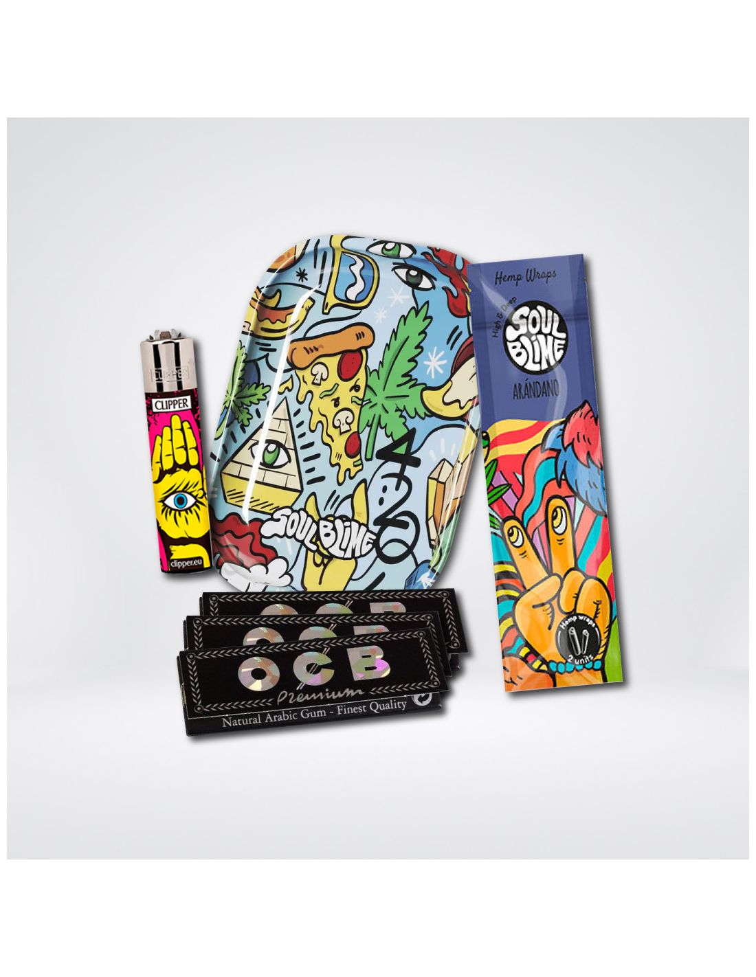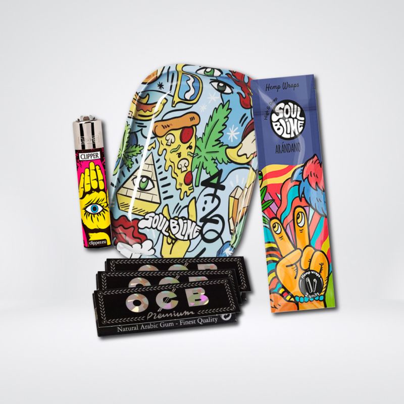 Eleva tu ritual de fumado con el Pack Clipper Soulblime Dulce 2, el kit definitivo para connaisseurs del cannabis que fusiona arte, sabor y conciencia ambiental. Incluye papelillos Premium OCB, una bandeja metálica Soulblime, un encendedor Clipper, todo complementado con Hemp Blunt Wraps orgánicos de Arándano, perfectos para un enrolado puro y natural. Este pack no solo satisface tus sentidos sino que también apoya un estilo de vida sostenible.