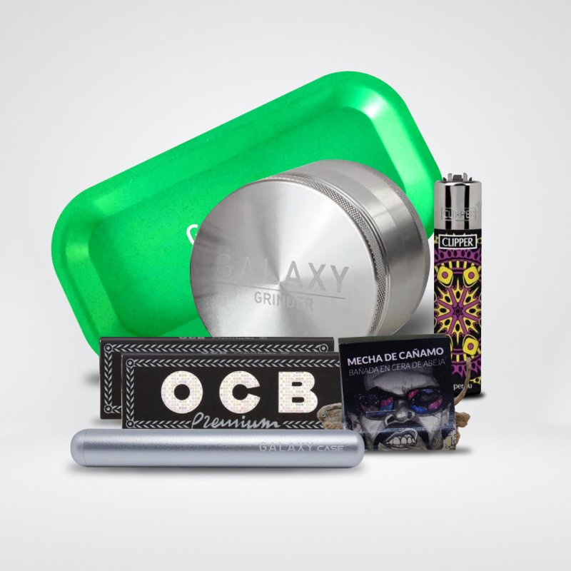 Descubre la combinación perfecta de estilo, funcionalidad y calidad con nuestro pack de consumo de cannabis. Desde el elegante Galaxy Grinder, el Galaxy Case para guardar tus caños hasta la práctica bandeja de rodar y los accesorios premium como el papel OCB y el encendedor Clipper, cada pieza ha sido seleccionada pensando en el consumidor exigente. Completa tu experiencia con la mecha de cáñamo Astro, y sumérgete en un mundo de sofisticación y placer natural.