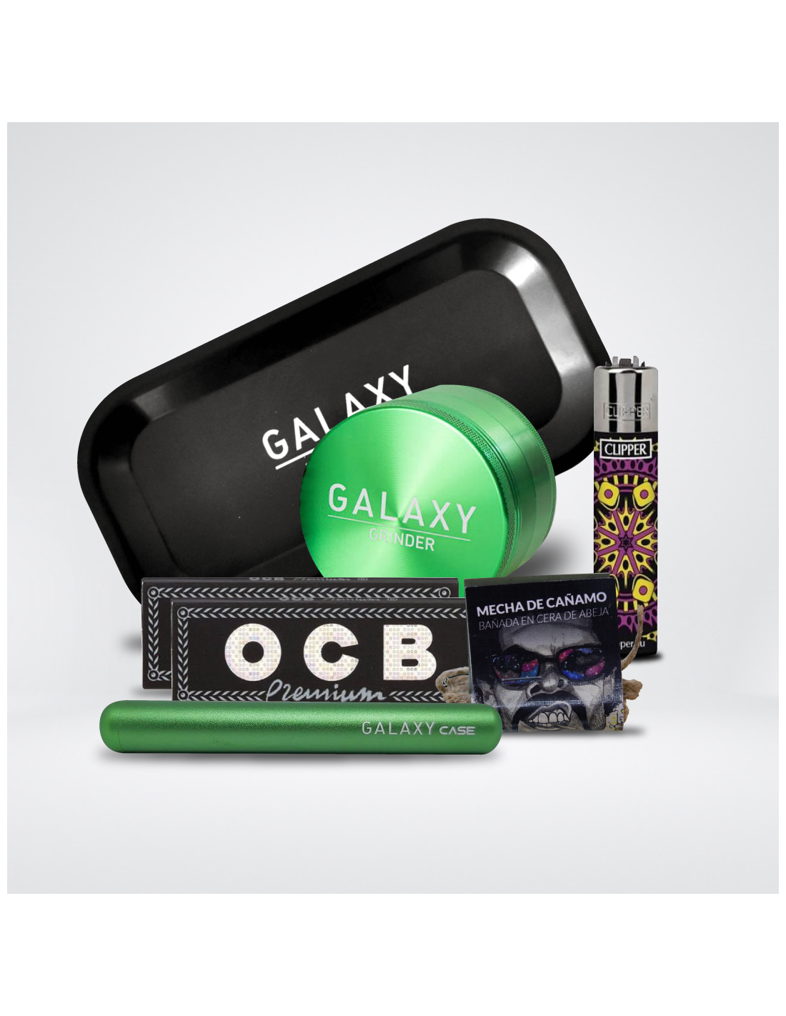 Este pack para consumo de cannabis incluye todo lo que necesitas para disfrutar de una buena sesión. El Galaxy Grinder de 38mm en color negro te permitirá triturar tus cogollos de forma eficiente y sin esfuerzo. La bandeja de rodar Galaxy Grinder Hemp en color blanco es perfecta para mantener tus utensilios organizados y limpios mientras preparas tus porros. Además, el pack incluye dos libritos de papel de liar OCB Negro Premium, de alta calidad y resistencia. Para encender tus porros, el encendedor Clipper de variedades es una excelente opción, con su llama ajustable y su diseño divertido y original. Para completar el pack, se incluye una mecha de cáñamo Astro de 1 metro, perfecta para los amantes de los porros naturales y sin aditivos. Y para transportar todo de forma segura y discreta, el estuche Galaxy Grinder en color negro es la opción ideal. ¡Disfruta de una sesión perfecta con este completo pack!