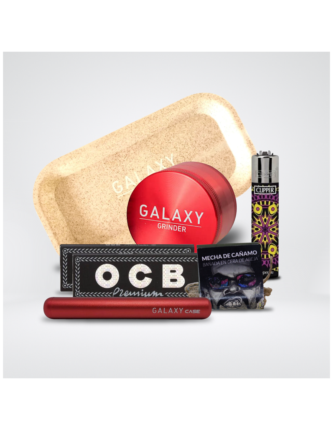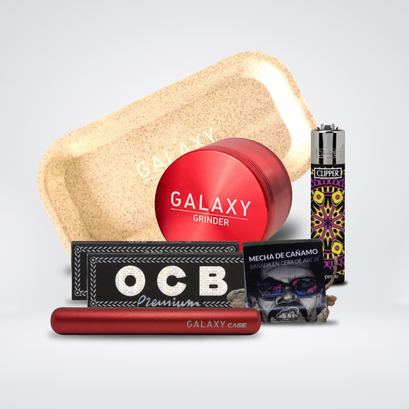 Este pack para consumo de cannabis incluye todo lo que necesitas para disfrutar de una buena sesión. El Galaxy Grinder de 38mm en color negro te permitirá triturar tus cogollos de forma eficiente y sin esfuerzo. La bandeja de rodar Galaxy Grinder Hemp en color blanco es perfecta para mantener tus utensilios organizados y limpios mientras preparas tus porros. Además, el pack incluye dos libritos de papel de liar OCB Negro Premium, de alta calidad y resistencia. Para encender tus porros, el encendedor Clipper de variedades es una excelente opción, con su llama ajustable y su diseño divertido y original. Para completar el pack, se incluye una mecha de cáñamo Astro de 1 metro, perfecta para los amantes de los porros naturales y sin aditivos. Y para transportar todo de forma segura y discreta, el estuche Galaxy Grinder en color negro es la opción ideal. ¡Disfruta de una sesión perfecta con este completo pack!