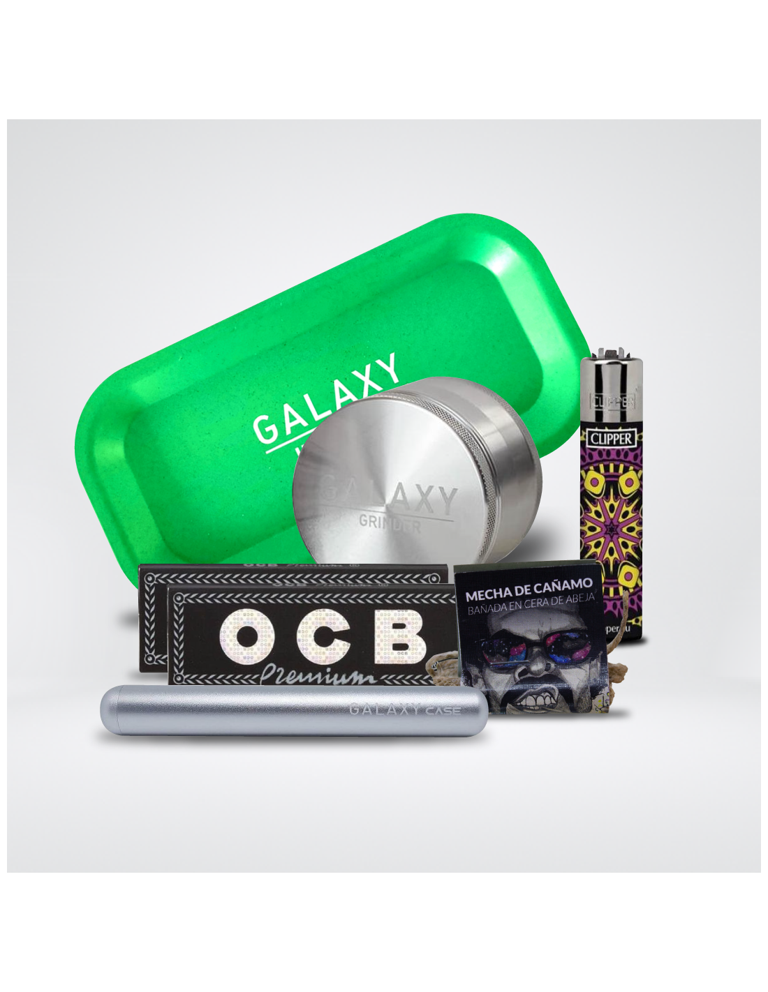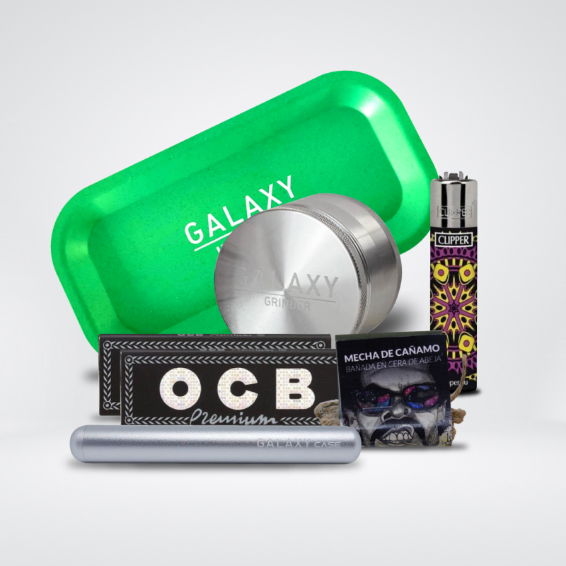 Este pack para consumo de cannabis incluye todo lo que necesitas para disfrutar de una buena sesión. El Galaxy Grinder de 38mm en color negro te permitirá triturar tus cogollos de forma eficiente y sin esfuerzo. La bandeja de rodar Galaxy Grinder Hemp en color blanco es perfecta para mantener tus utensilios organizados y limpios mientras preparas tus porros. Además, el pack incluye dos libritos de papel de liar OCB Negro Premium, de alta calidad y resistencia. Para encender tus porros, el encendedor Clipper de variedades es una excelente opción, con su llama ajustable y su diseño divertido y original. Para completar el pack, se incluye una mecha de cáñamo Astro de 1 metro, perfecta para los amantes de los porros naturales y sin aditivos. Y para transportar todo de forma segura y discreta, el estuche Galaxy Grinder en color negro es la opción ideal. ¡Disfruta de una sesión perfecta con este completo pack!
