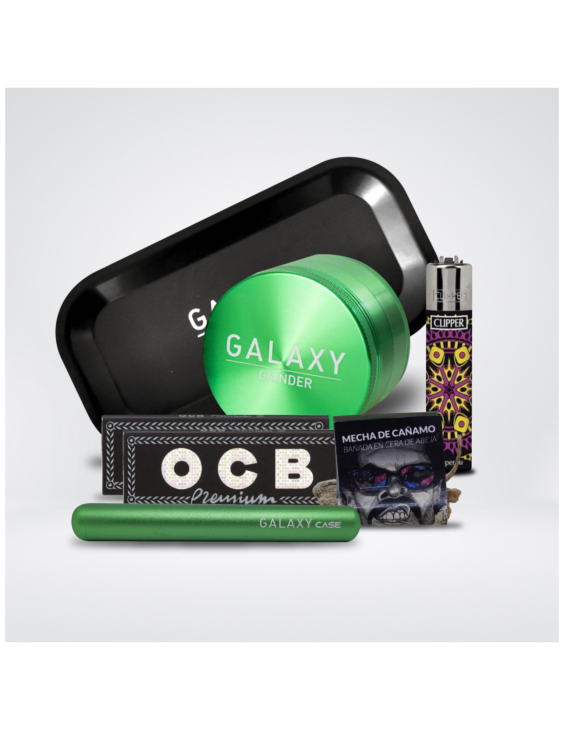 Descubre la combinación perfecta de estilo, funcionalidad y calidad con nuestro pack de consumo de cannabis. Desde el elegante Galaxy Grinder, el Galaxy Case para guardar tus caños hasta la práctica bandeja de rodar y los accesorios premium como el papel OCB y el encendedor Clipper, cada pieza ha sido seleccionada pensando en el consumidor exigente. Completa tu experiencia con la mecha de cáñamo Astro, y sumérgete en un mundo de sofisticación y placer natural.