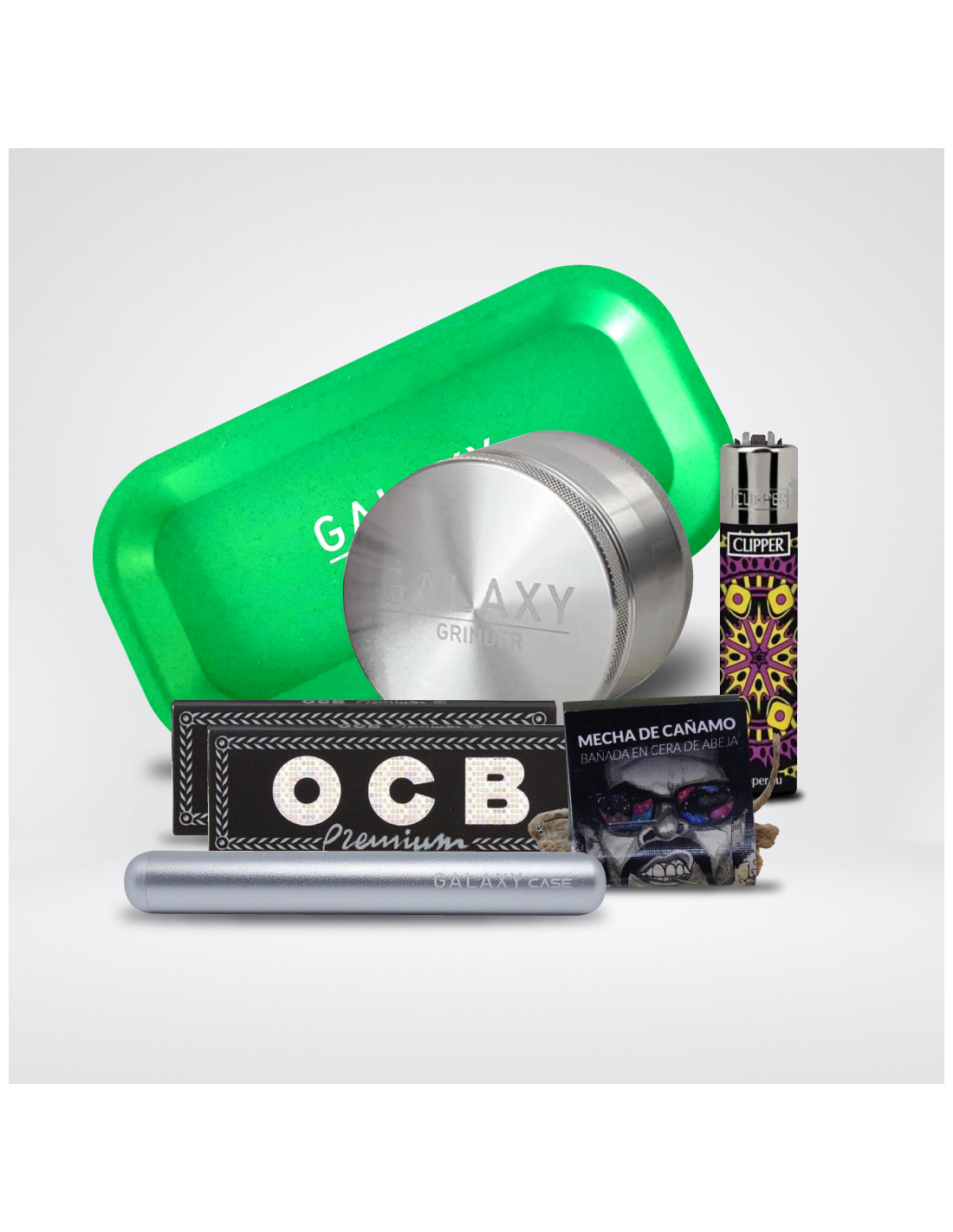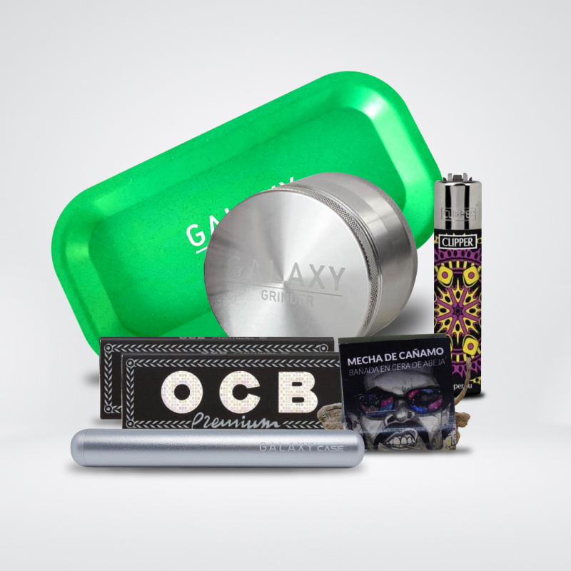 Descubre la combinación perfecta de estilo, funcionalidad y calidad con nuestro pack de consumo de cannabis. Desde el elegante Galaxy Grinder, el Galaxy Case para guardar tus caños hasta la práctica bandeja de rodar y los accesorios premium como el papel OCB y el encendedor Clipper, cada pieza ha sido seleccionada pensando en el consumidor exigente. Completa tu experiencia con la mecha de cáñamo Astro, y sumérgete en un mundo de sofisticación y placer natural.