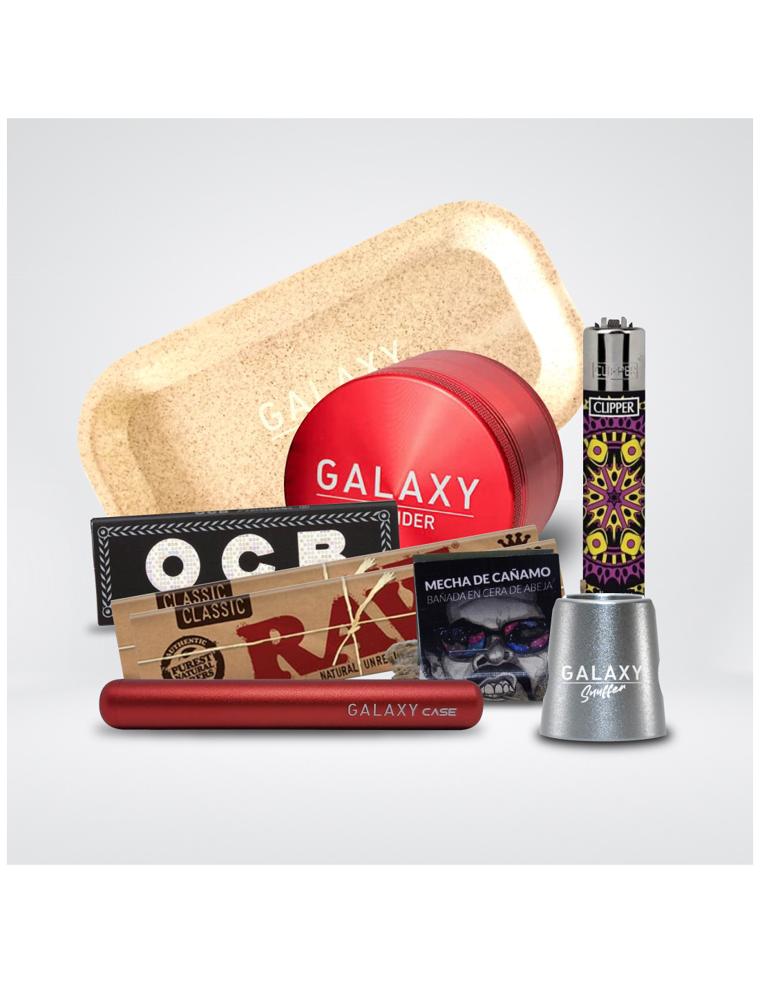 Acompañando al grinder, encuentra una serie de accesorios Galaxy tales como la bandeja de enrolar Hemp para armar tus porros, un Galaxy Case ideal para mantener a salvo tus joints y un Galaxy Snuffer para apagar tus porros de manera efectiva y segura. Enciende tus creaciones con el encendedor Clipper incluido, que no solo ofrece una variedad de diseños para reflejar tu estilo, sino que también es recargable.