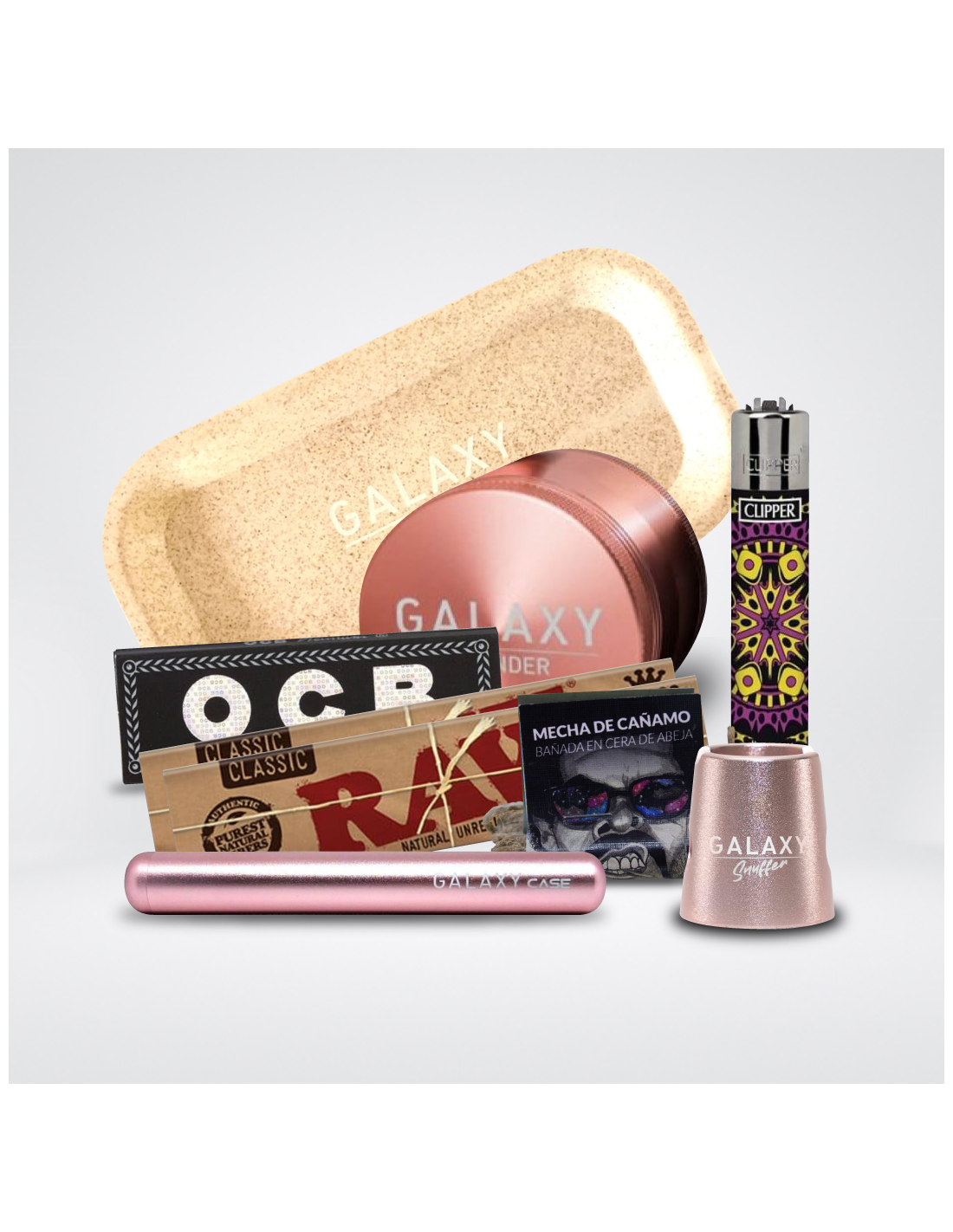 Acompañando al grinder, encuentra una serie de accesorios Galaxy tales como la bandeja de enrolar Hemp para armar tus porros, un Galaxy Case ideal para mantener a salvo tus joints y un Galaxy Snuffer para apagar tus porros de manera efectiva y segura. Enciende tus creaciones con el encendedor Clipper incluido, que no solo ofrece una variedad de diseños para reflejar tu estilo, sino que también es recargable.