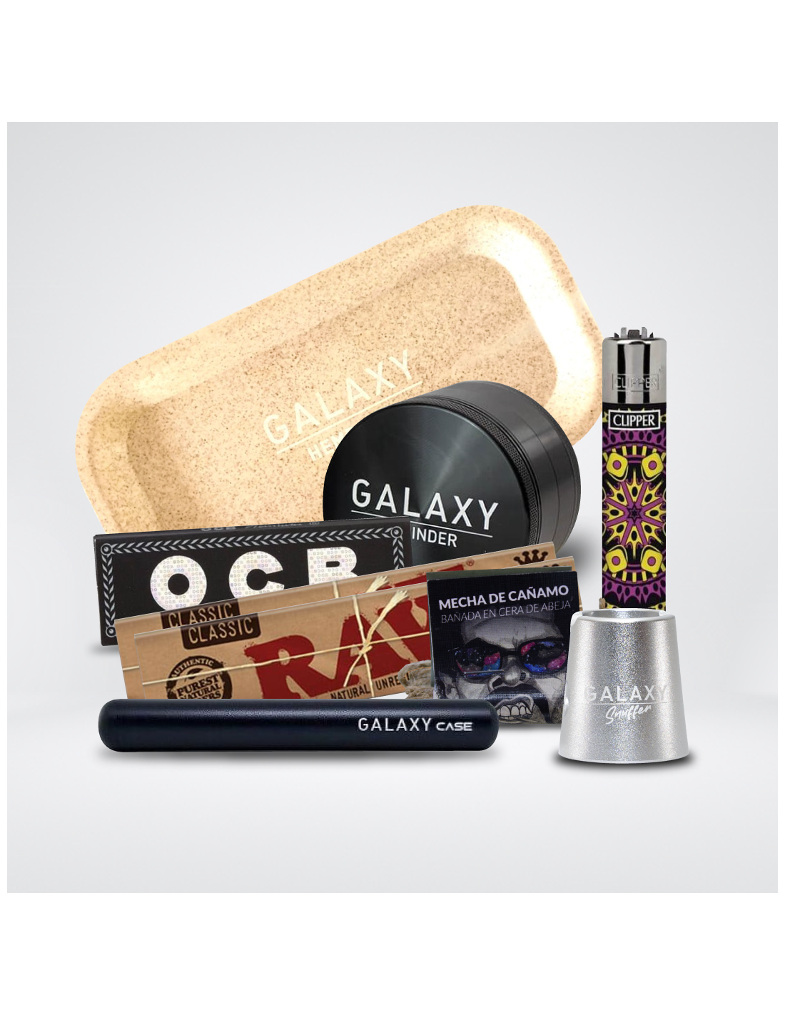 Acompañando al grinder, encuentra una serie de accesorios Galaxy tales como la bandeja de enrolar Hemp para armar tus porros, un Galaxy Case ideal para mantener a salvo tus joints y un Galaxy Snuffer para apagar tus porros de manera efectiva y segura. Enciende tus creaciones con el encendedor Clipper incluido, que no solo ofrece una variedad de diseños para reflejar tu estilo, sino que también es recargable.