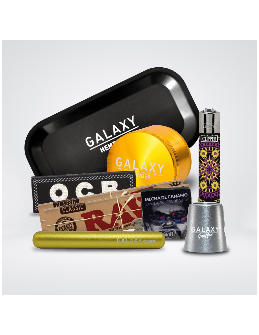 Eleva tu experiencia de cannabis con nuestro pack completo, ideal para los verdaderos aficionados. Consta del eficiente Galaxy Grinder de 38 mm, bandeja de enrolar Galaxy, Galaxy Case y Snuffer, encendedor Clipper multifuncional, papelillos RAW y OCB para fumadas puras, mecha de cáñamo Astro para sesiones continuas. Un kit esencial para disfrutar con estilo, comodidad y calidad.