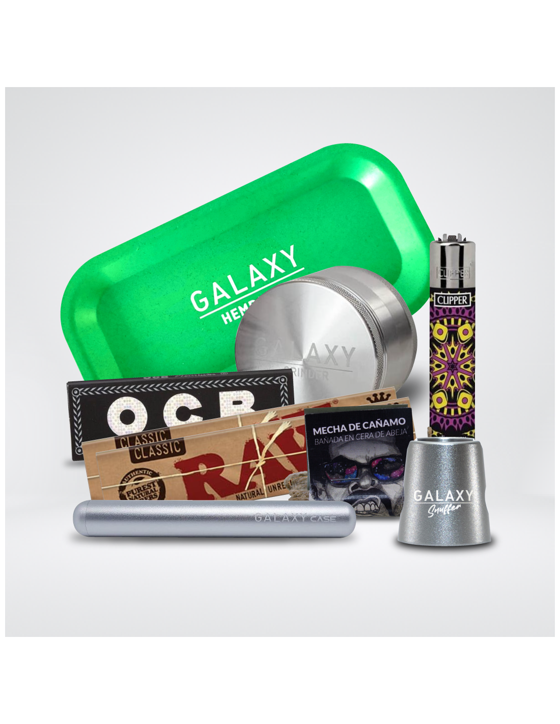 Eleva tu experiencia de cannabis con nuestro pack completo, ideal para los verdaderos aficionados. Consta del eficiente Galaxy Grinder de 38 mm, bandeja de enrolar Galaxy, Galaxy Case y Snuffer, encendedor Clipper multifuncional, papelillos RAW y OCB para fumadas puras, mecha de cáñamo Astro para sesiones continuas. Un kit esencial para disfrutar con estilo, comodidad y calidad.