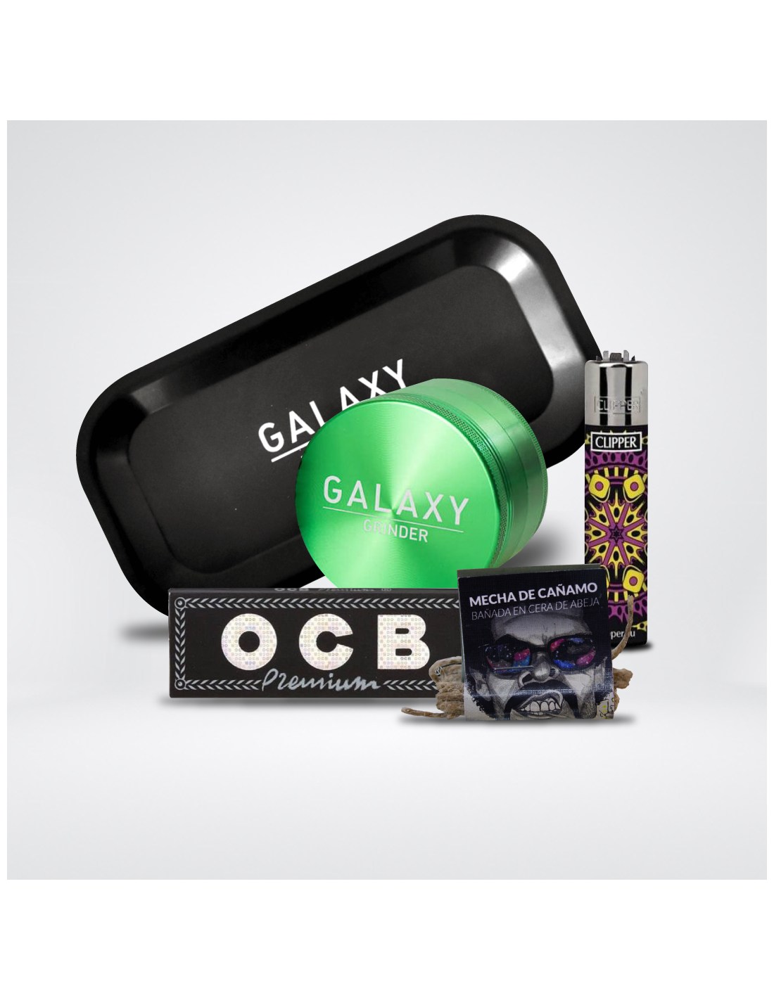 Eleva tu ritual de cannabis con este exclusivo pack, diseñado meticulosamente para los aficionados que valoran la calidad y la comodidad. Este conjunto integral transforma cada sesión en una experiencia sofisticada y placentera, destacando por su funcionalidad y estilo. El corazón del pack es el Galaxy Grinder de 38mm, una obra maestra en diferentes colores que garantiza una molida perfecta de tus cogollos, preservando su frescura y potenciando su aroma. Acompañándolo, la bandeja de enrolado de hemp Galaxy que no solo es práctica sino también un accesorio distintivo que refleja tu pasión por el universo del cannabis.