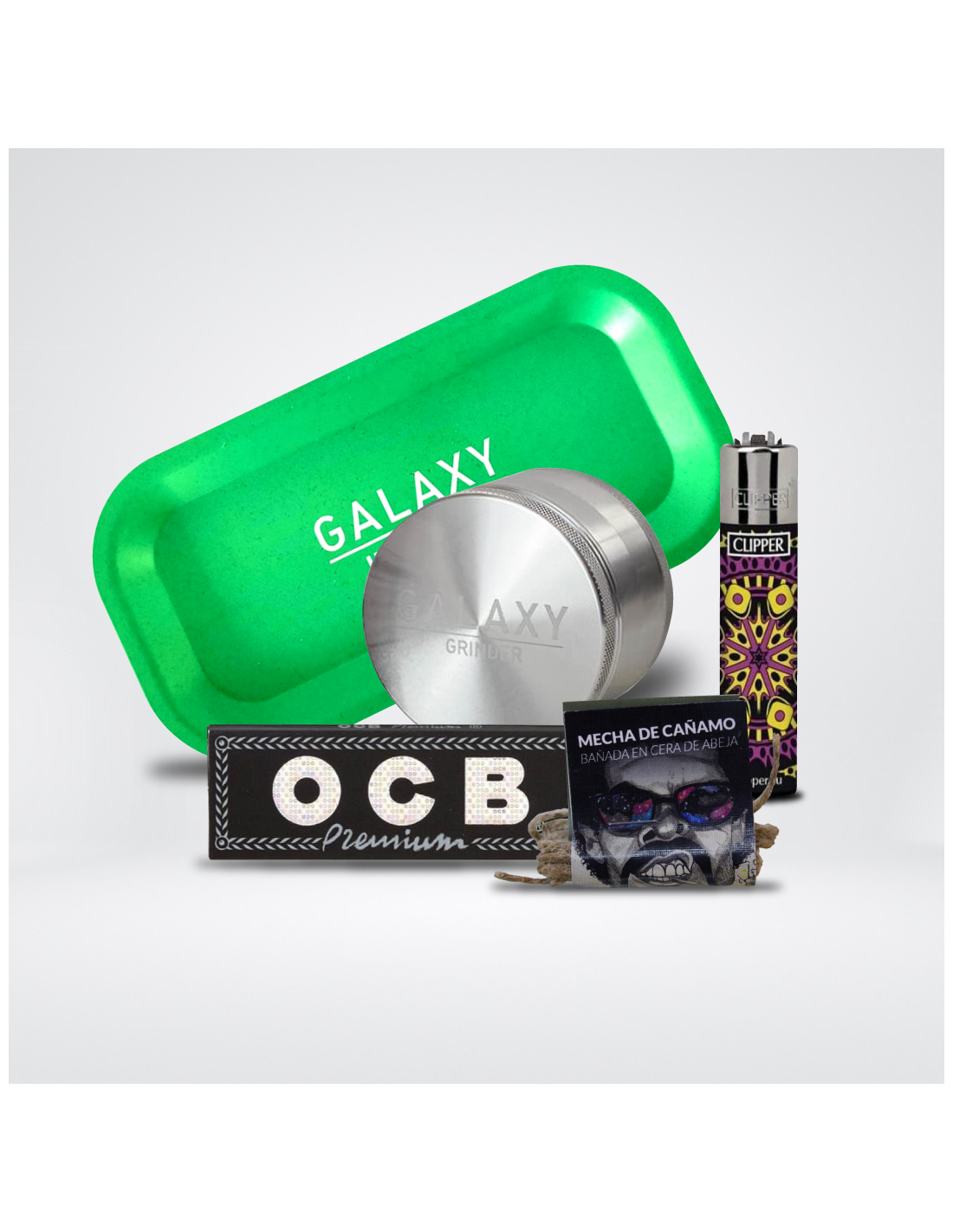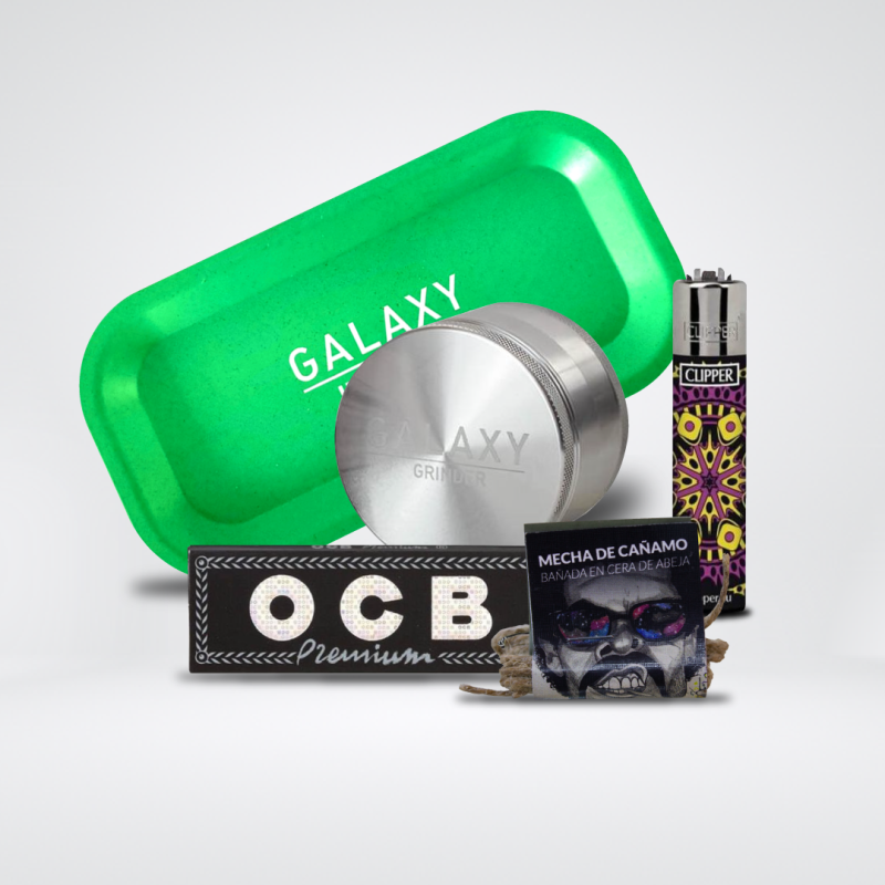 Eleva tu ritual de cannabis con este exclusivo pack, diseñado meticulosamente para los aficionados que valoran la calidad y la comodidad. Este conjunto integral transforma cada sesión en una experiencia sofisticada y placentera, destacando por su funcionalidad y estilo. El corazón del pack es el Galaxy Grinder de 38mm, una obra maestra en diferentes colores que garantiza una molida perfecta de tus cogollos, preservando su frescura y potenciando su aroma. Acompañándolo, la bandeja de enrolado de hemp Galaxy que no solo es práctica sino también un accesorio distintivo que refleja tu pasión por el universo del cannabis.